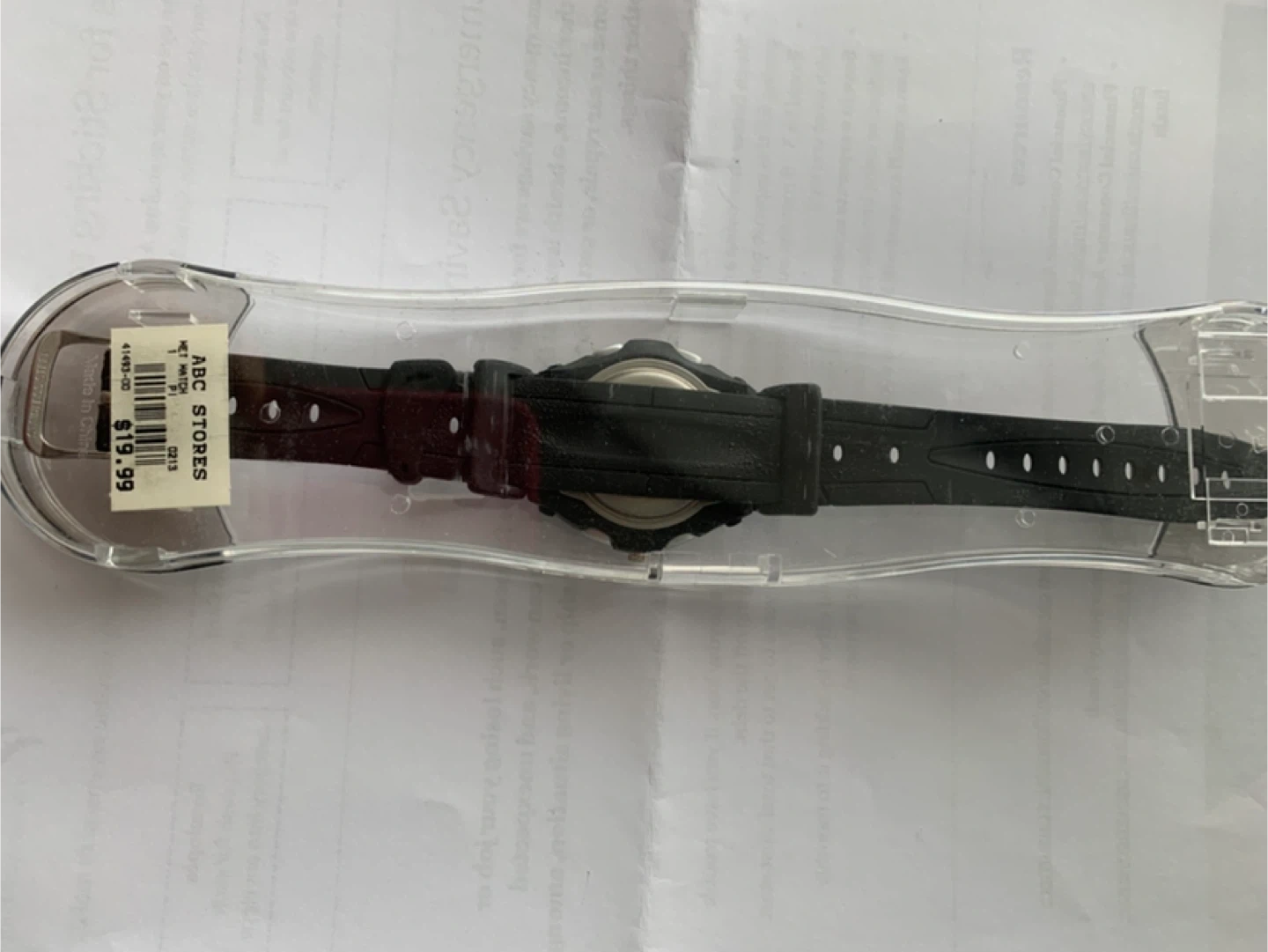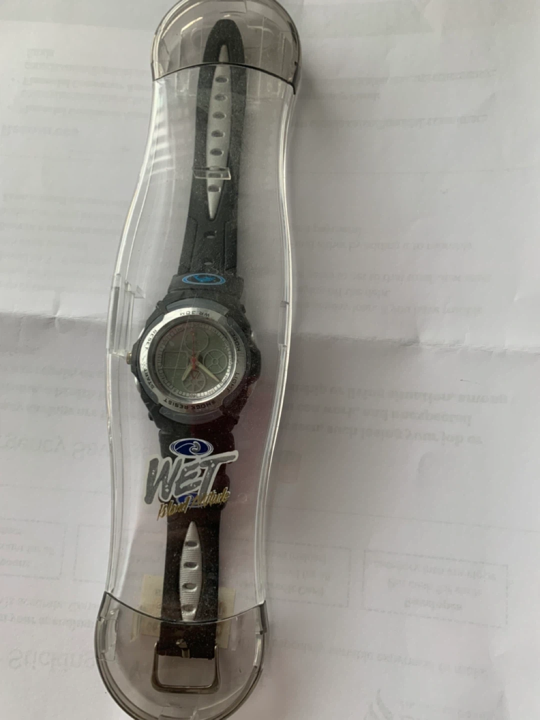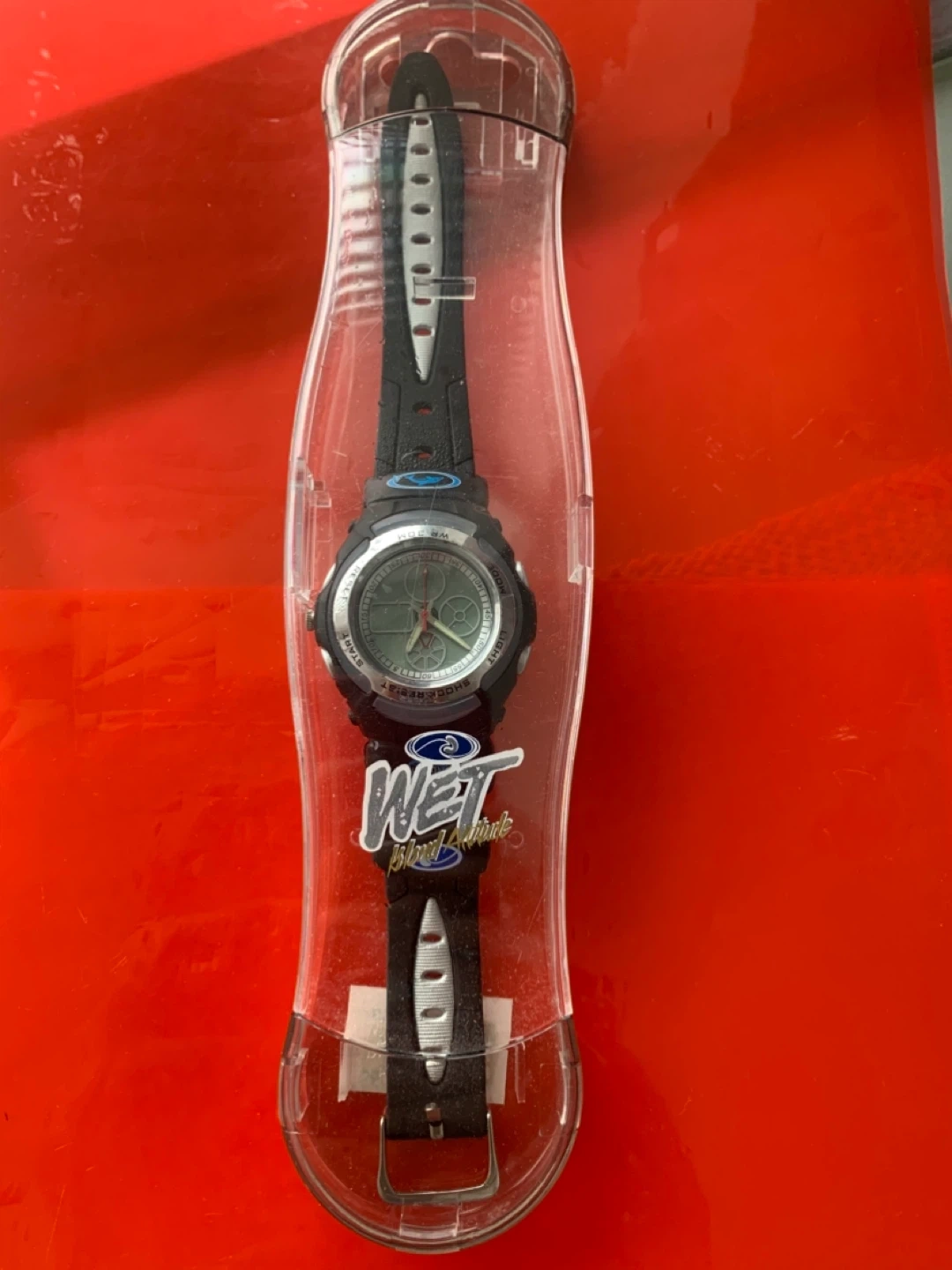 This WET "Island Attitude" watch is in its original case. It features shock resistance and water resistance up to 30m. The band is black and adjustable.