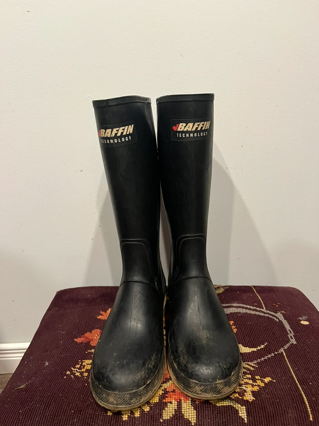 194Selling a pair of Steel-toe Baffin rubber boots in black. They're in good condition and ready for some outdoor adventures!