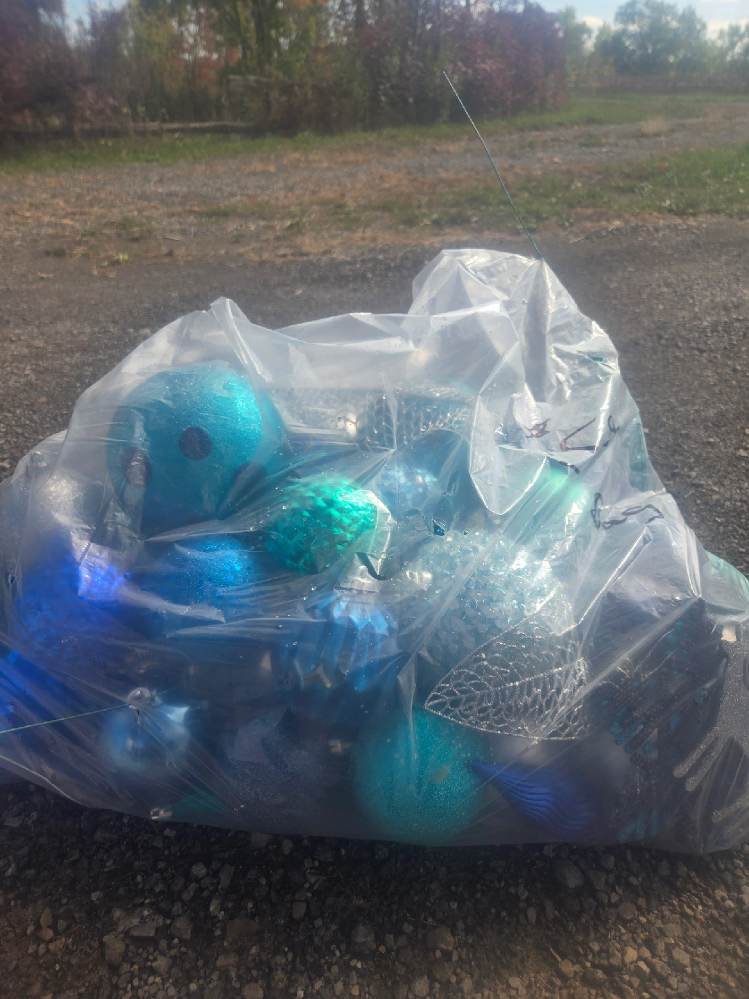 Selling a bag of blue Christmas ornaments. They're a mix of different shades and textures, perfect for adding some sparkle to your tree this holiday season