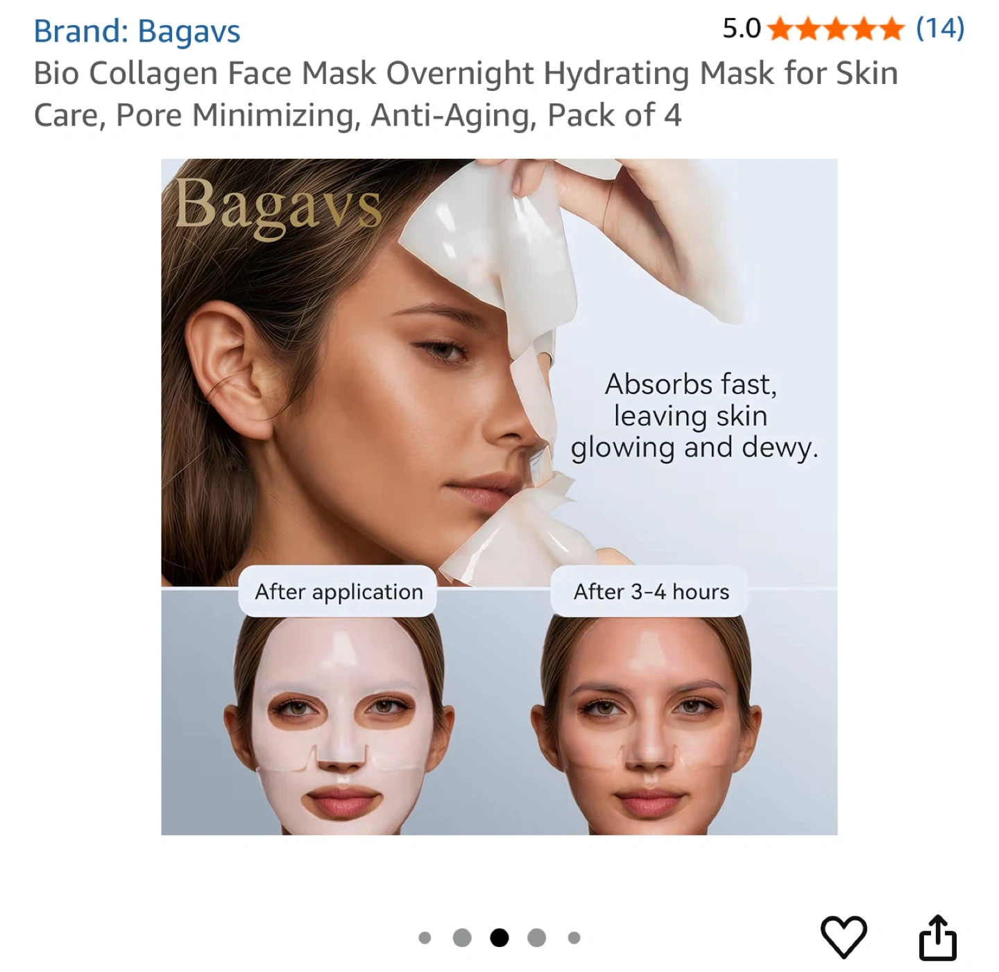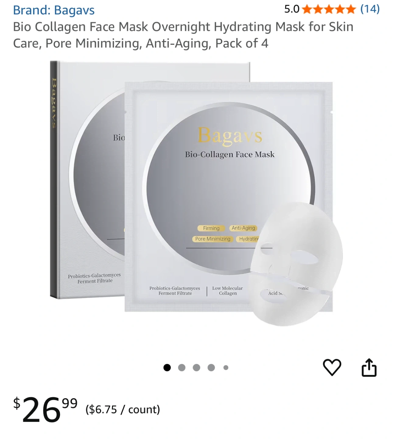 65Bagavs Bio Collagen Face Mask for skin care! This overnight hydrating mask is designed to minimize pores and provide anti-aging benefits. It's a pack of 4, so you'll have plenty to keep your skin feeling great. Key ingredients include probiotics, low molecular collagen, niacinamide, and hyaluronic acid, which firm, improve elasticity, reduce wrinkles, and hydrate your skin