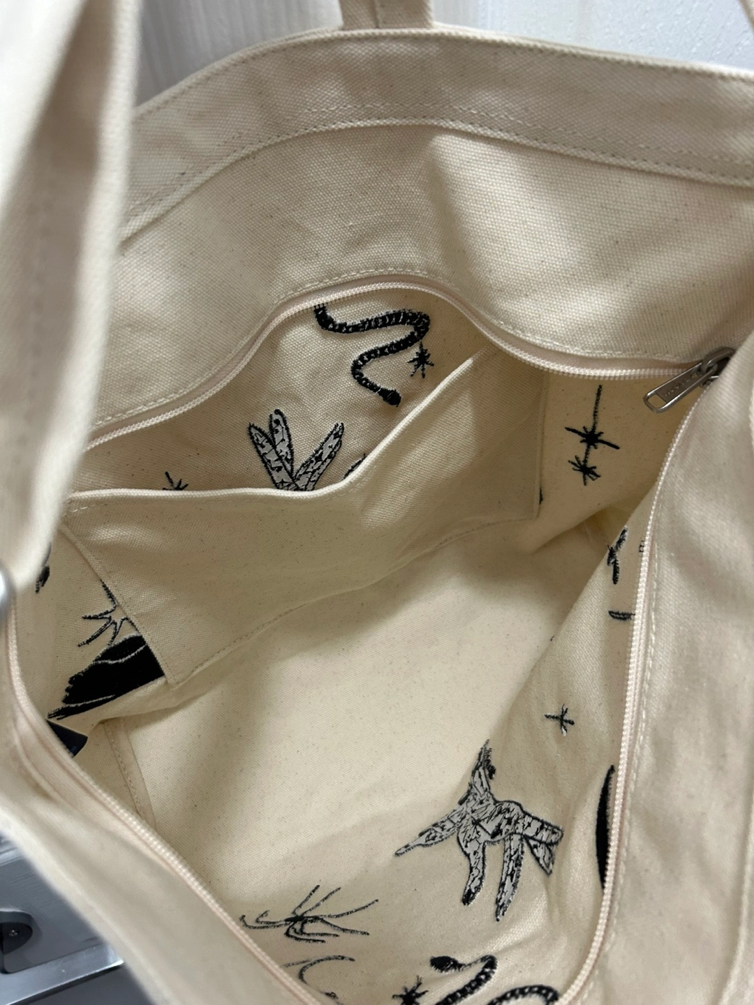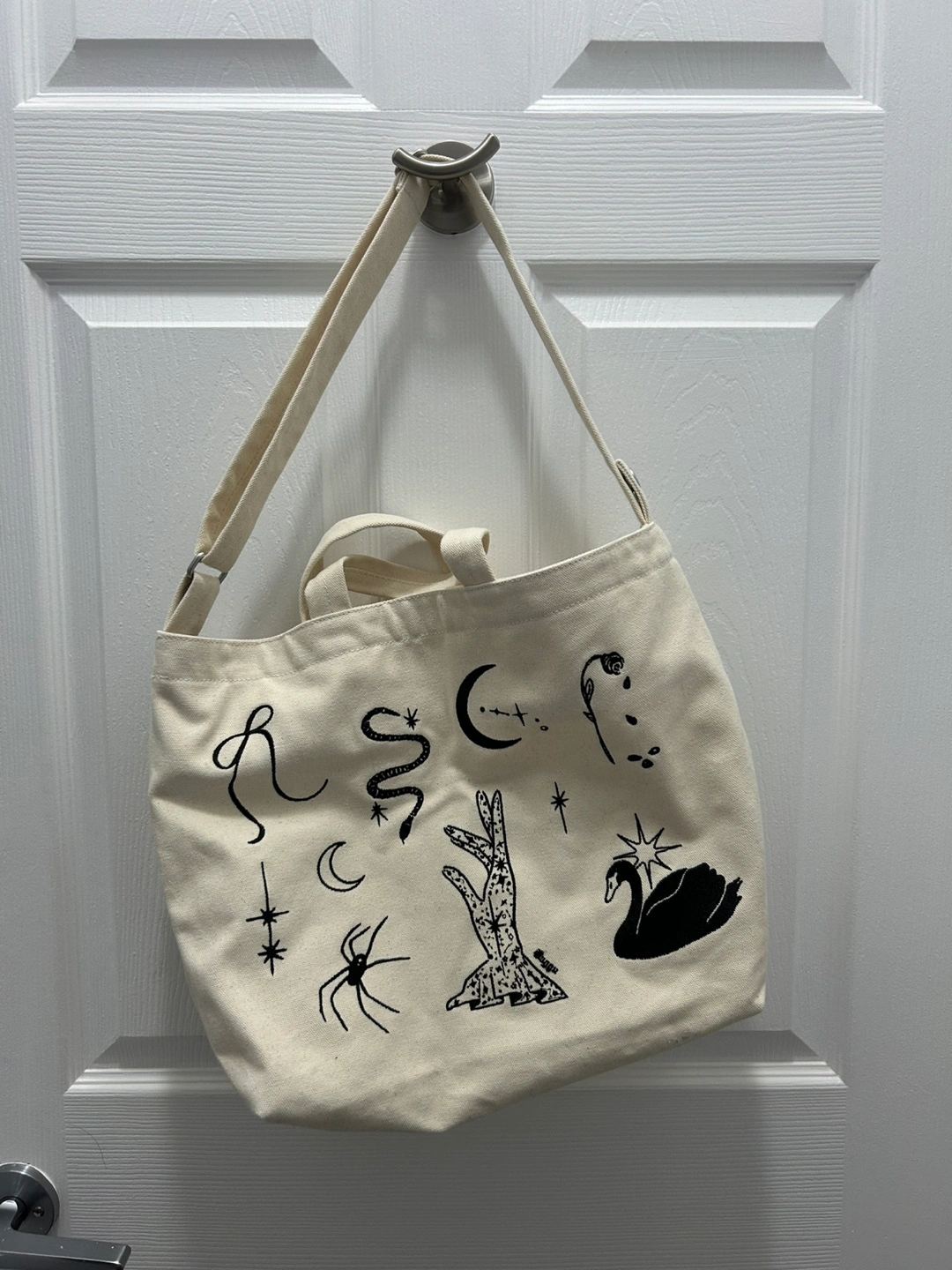 Brand new Baggu Horizontal Duck Bag in Embroidered Ballet pattern. Thick, sturdy canvas bag with black embroidered icons. Perfect condition. Never worn. Zipper closure. Adjustable shoulder strap. Top handles. One interior pocket. Fits 13” laptop.