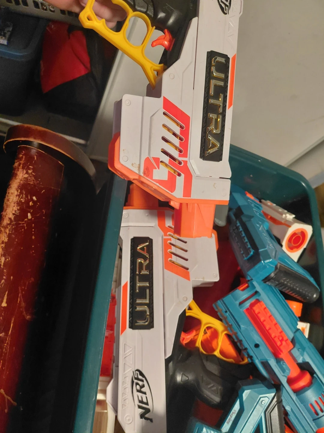 White and orange Nerf Ultra foam blasters are included. This set features multiple blasters in a bin. Great for outdoor play!