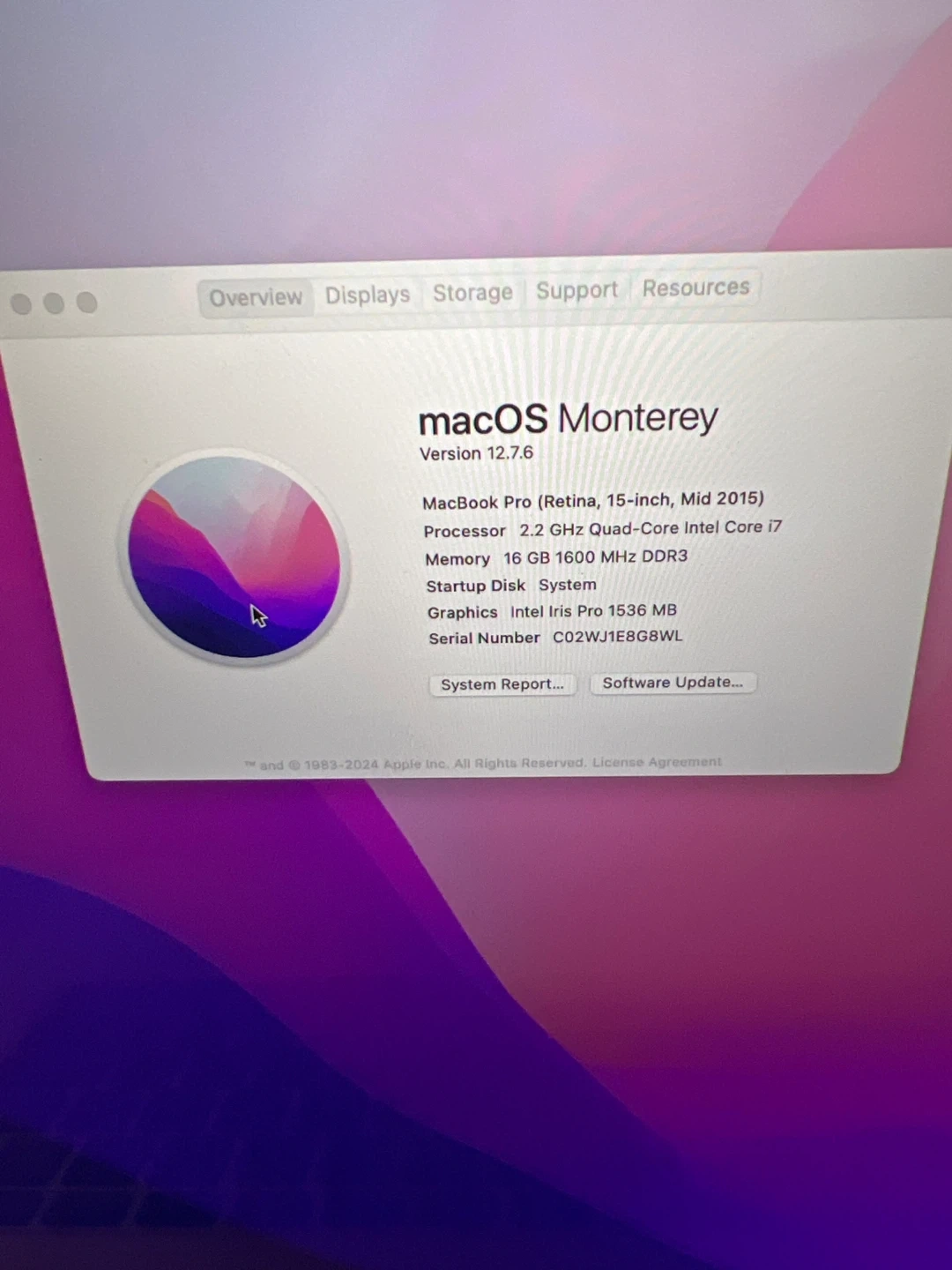 Processor 2.2 GHz Quad-Core Intel Core i7. Memory 16 GB 1600 MHz DDR3.
