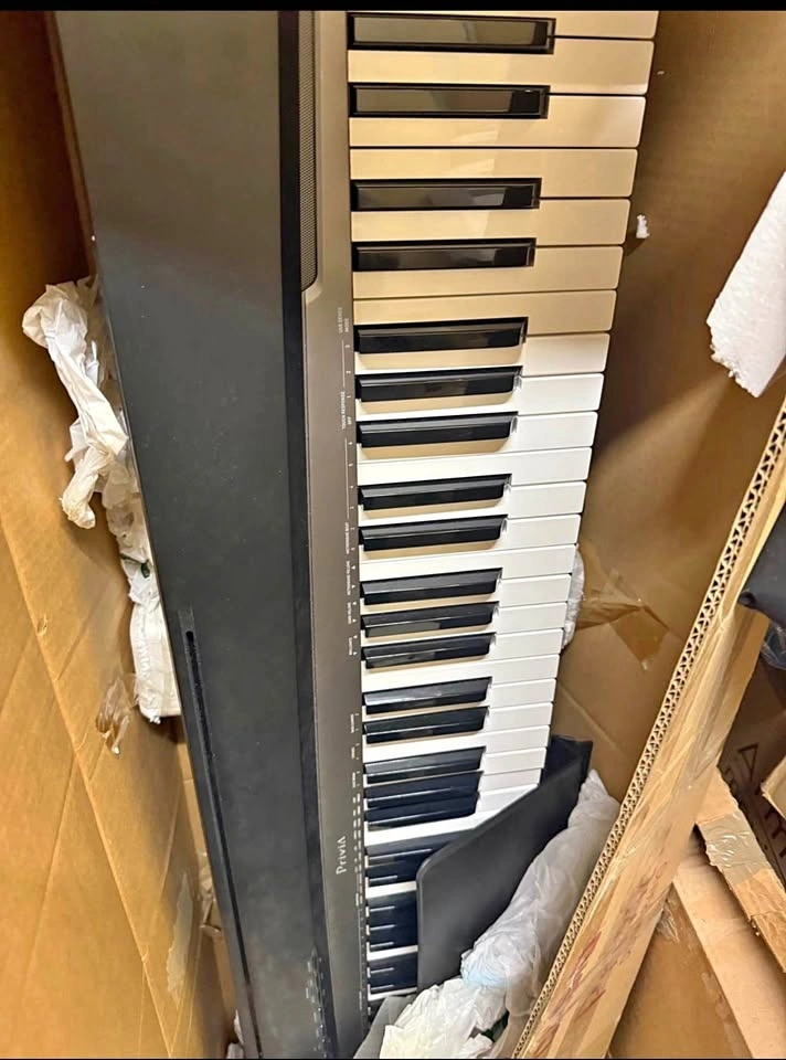 This digital piano features 88 keys with a scaled hammer action to simulate the feel of an acoustic grand piano. It includes advanced sound engine technology with stereo-sampled tones and 128-note polyphony, allowing for complex musical passages without dropped notes. The keyboard weighs approximately 26 pounds.