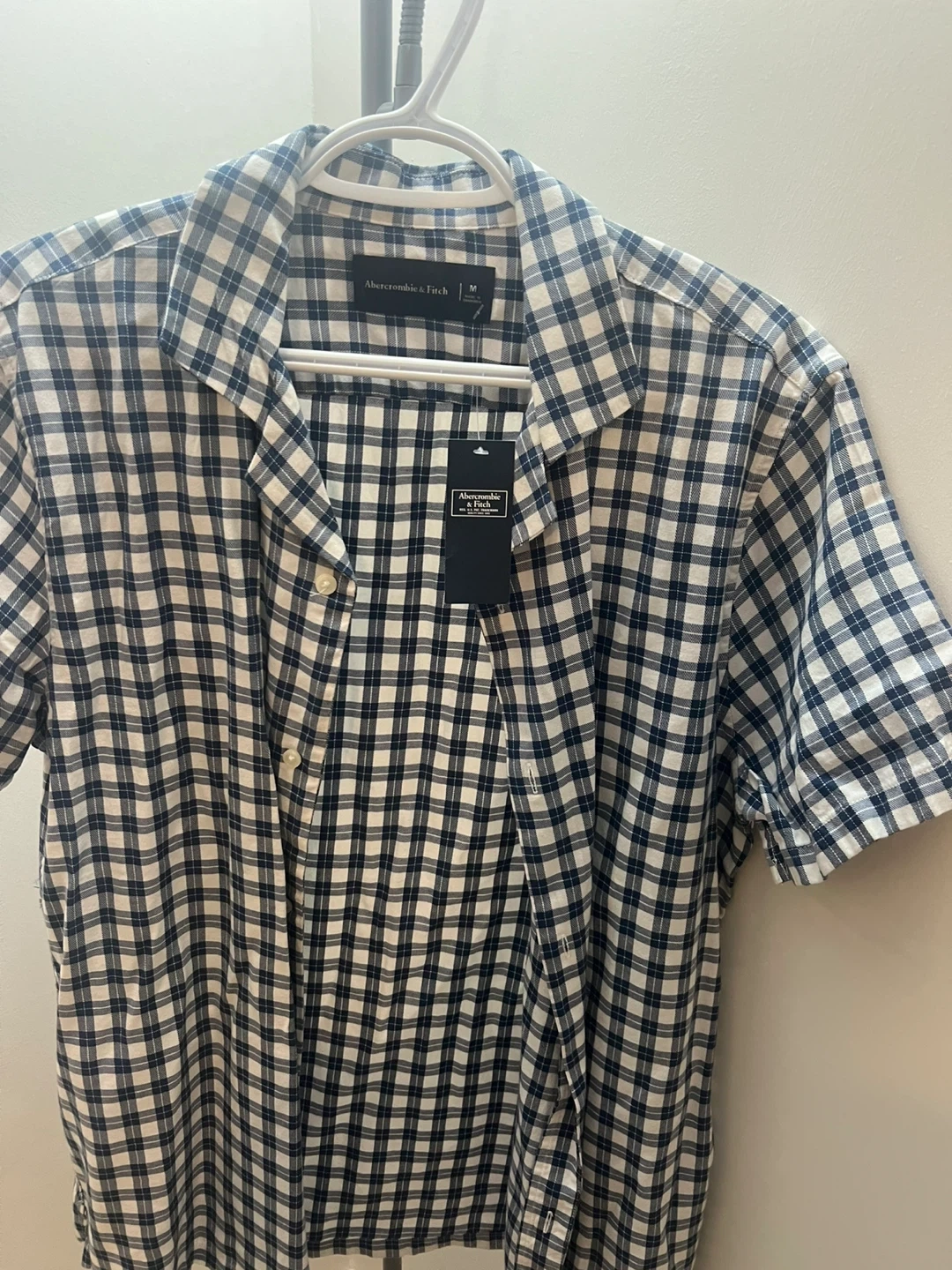 This is a men's short sleeve button-up shirt from Abercrombie & Fitch. It features a classic blue and white gingham pattern. The shirt is size medium and made of a breathable fabric. Perfect for casual wear during warmer months!