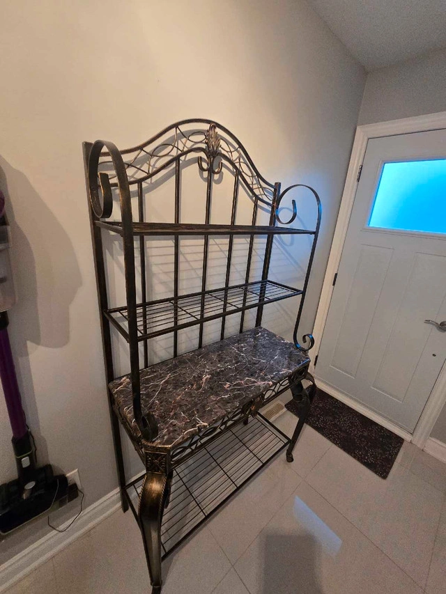 Add a touch of elegance to your home with this used, ornate metal bakers rack, featuring a faux marble shelf, perfect for displaying plants or kitchenware. This baker's rack has a faux marble shelf, and 3 additional shelves, and is in good condition. It is sturdy, and will add a great decorative touch to any kitchen. Here are the specs: * Ornate metal frame * Faux marble shelf * 3 metal shelves Dimensions: 72 inches tall, 42 inches wide, 20 inches deep (accounting for legs) If the ad is up, it's still available!