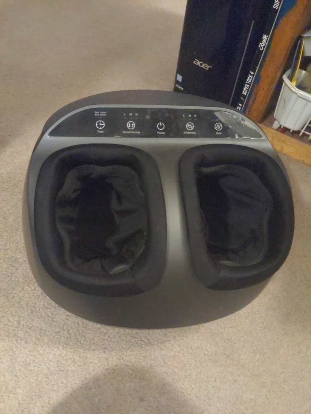 This foot massager offers kneading and air intensity options. It includes settings for time, power, and heat. You can adjust the kneading intensity and air intensity to your preference.