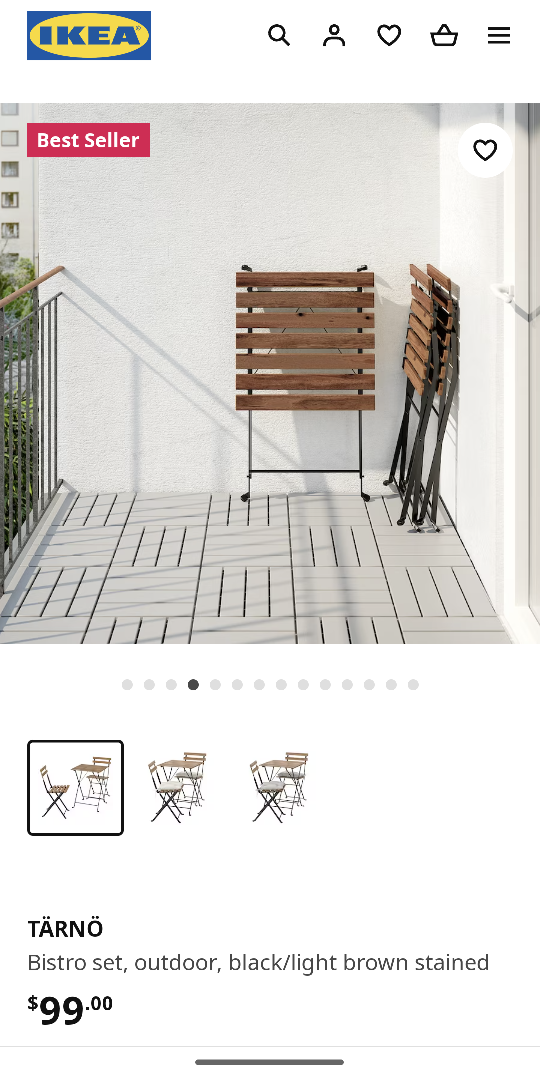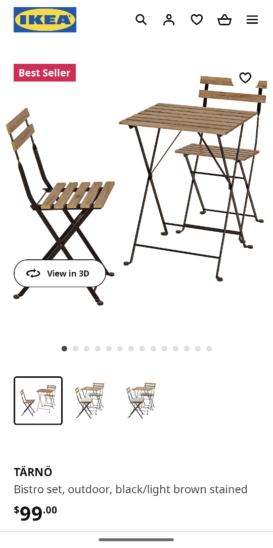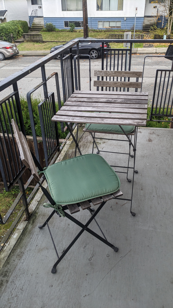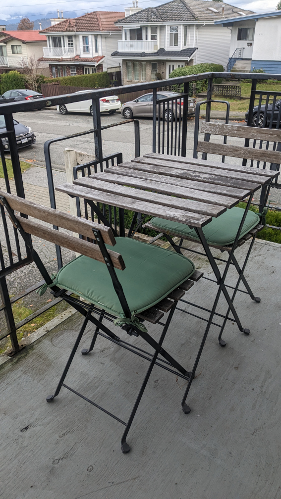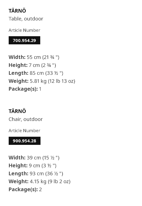 10Ikea balcony table and 2 chairs TARNO great condition TÄRNÖ Table, outdoor Width: 55 cm (21 ¾ ") Height: 7 cm (2 ¾ ") Length: 85 cm (33 ½ ") Weight: 5.81 kg (12 lb 13 oz) Chair, outdoor Width: 39 cm (15 ½ ") Height: 9 cm (3 ½ ") Length: 93 cm (36 ½ ") Weight: 4.15 kg (9 lb 2 oz)