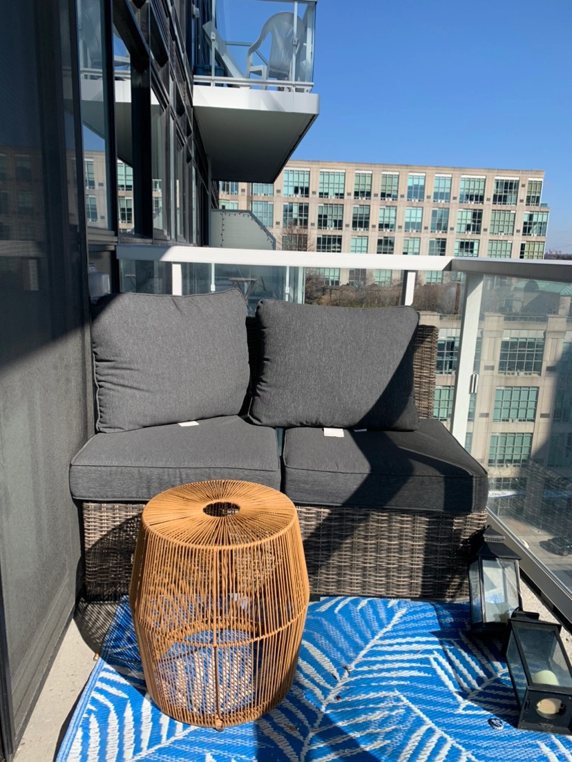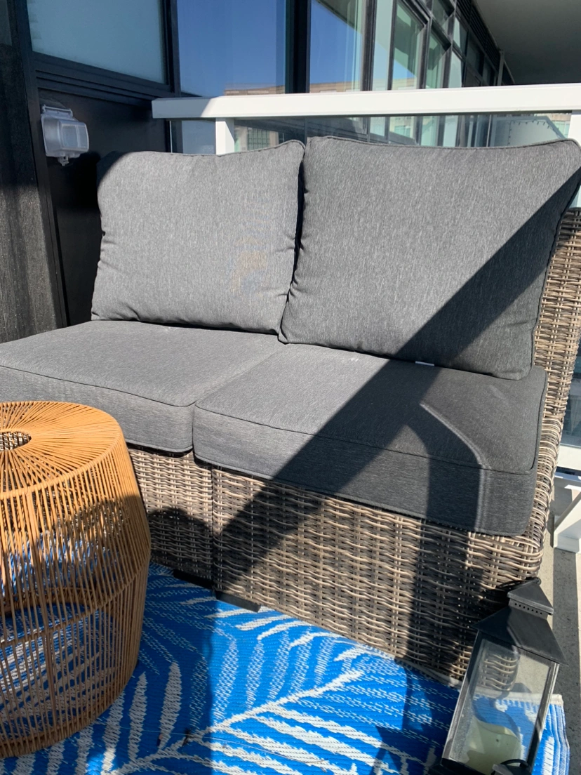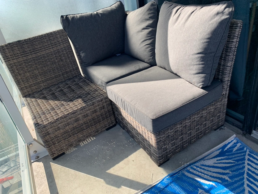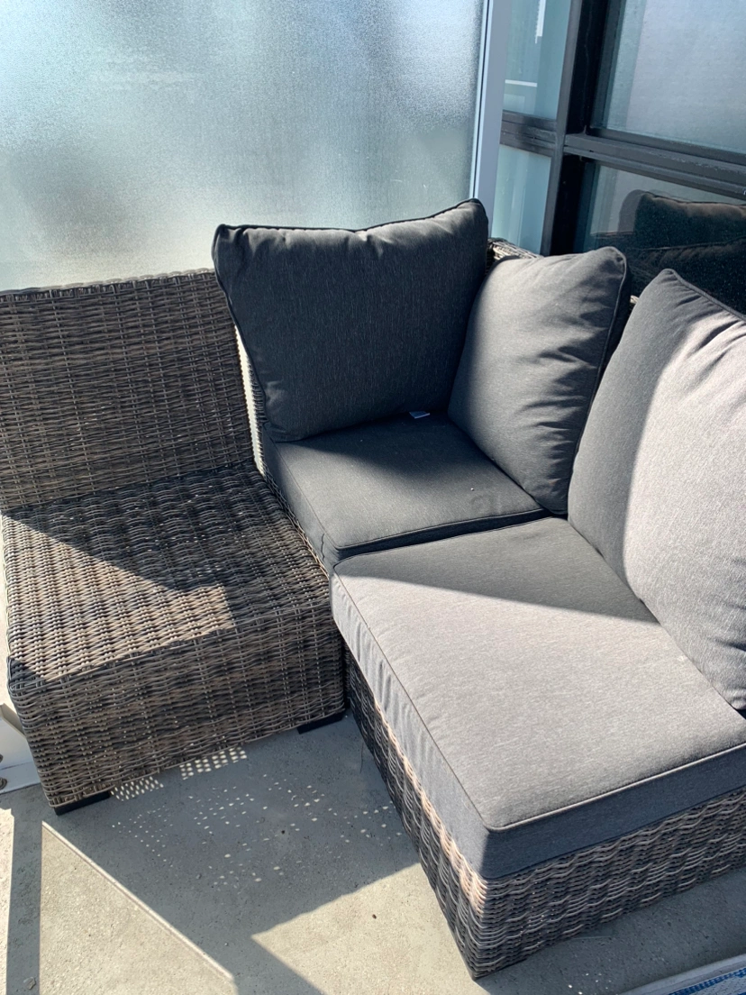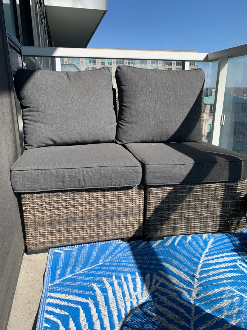 5 balcony chairs that connect, can be set up as one long sectional or separated depending on your yard/balcony set up. One chair is missing pillows as they flew off my balcony lol. Pick up only, but ensure you have a large vehicle as they do not dissemble. Originally from the brick $1200. Will throw in free outdoor side table for best offer.