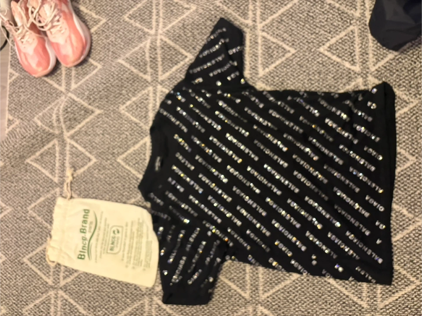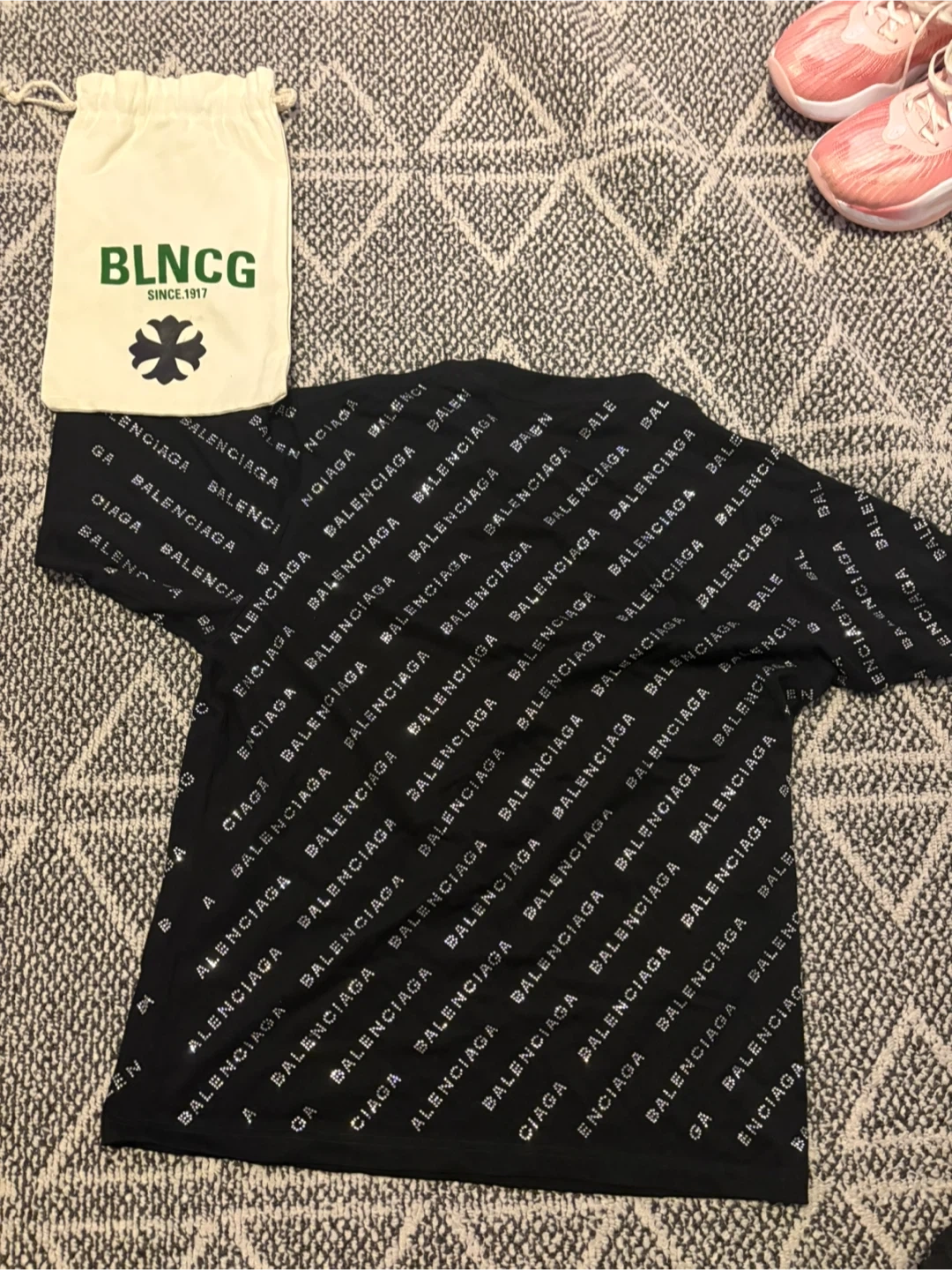 Selling a Balenciaga all over logo t-shirt. It is black with the Balenciaga logo printed all over it. Comes with the original dust bag.