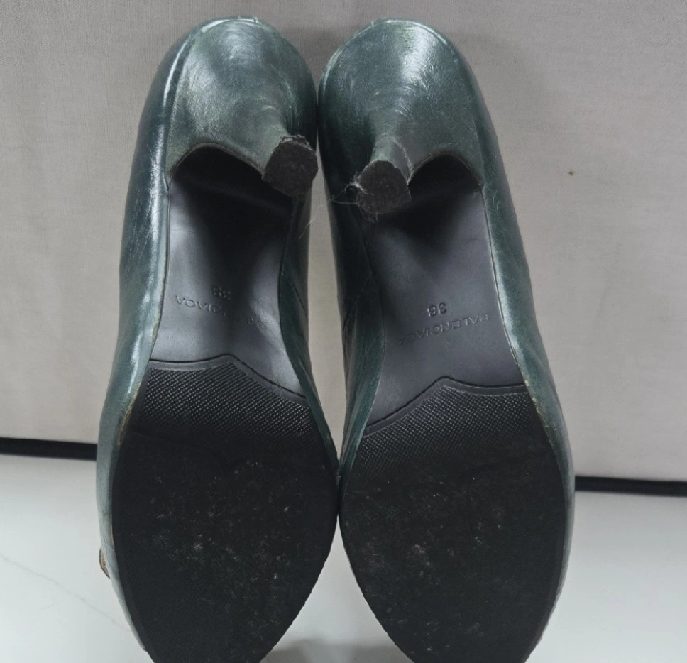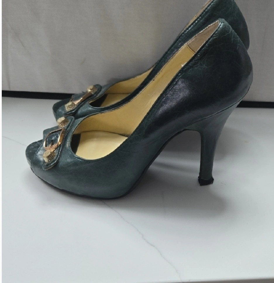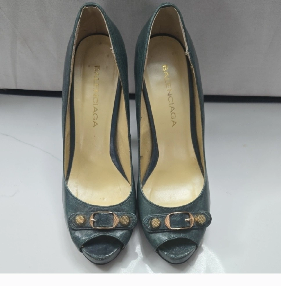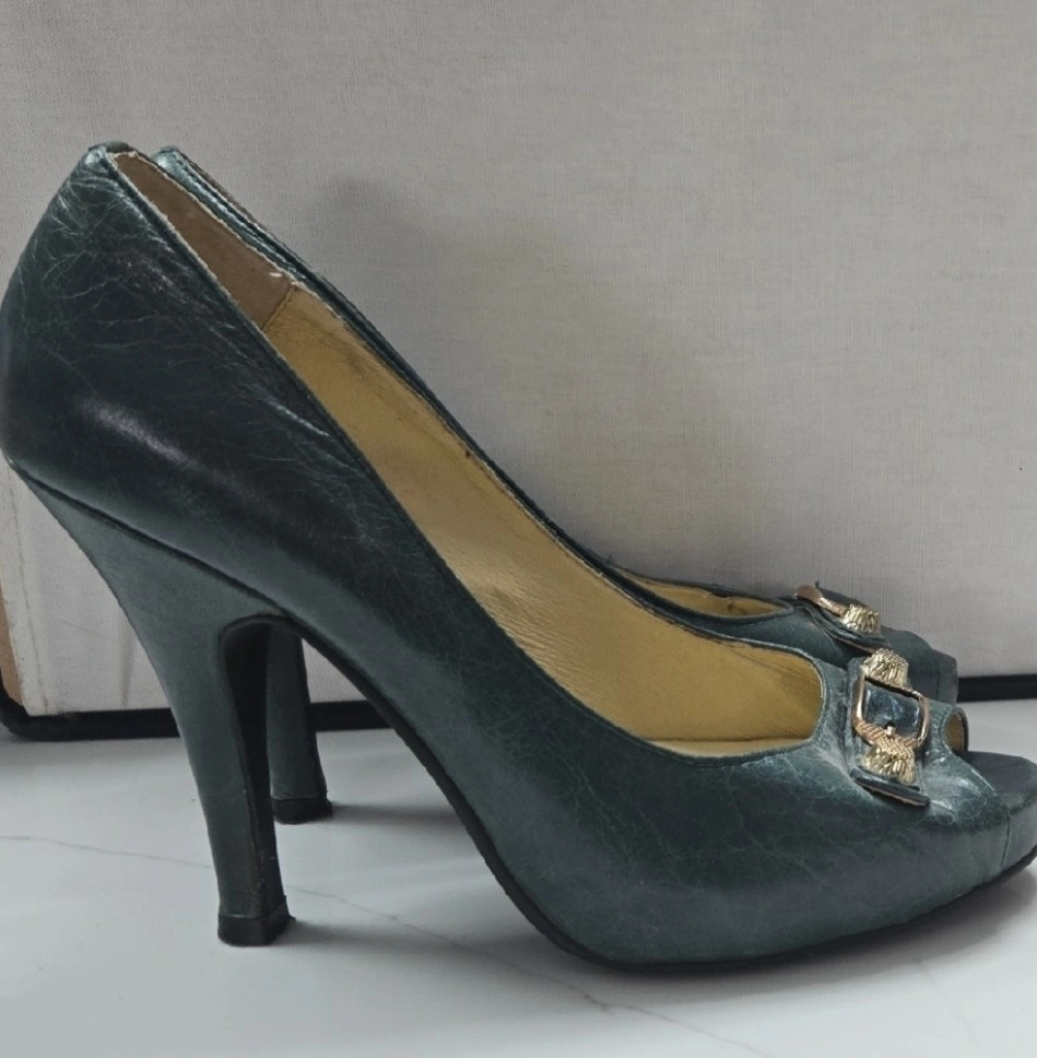 18Selling a pair of Balenciaga heels in size 38. They are a beautiful dark green colour and feature a peep toe design with a gold buckle detail. They show some signs of wear but are still in good condition for their age!