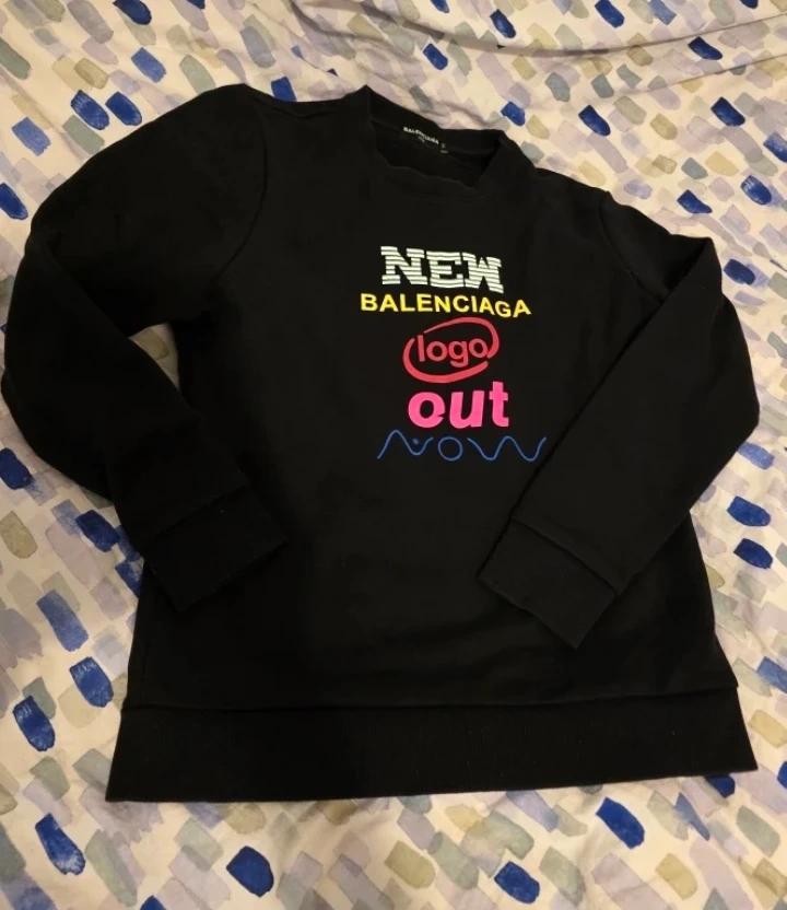 763Selling an Authentic Balenciaga sweatshirt in black with the 'Logo Out' design. It's in great condition and features the Balenciaga logo on the front and '57 Avenue Montaigne 75008 Paris' on the back with a rainbow detail. Excellent condition. BOUGHT in Tokyo. Kindly check my other uncommon goodies and souvenirs from Japan etc. This is the lowest you can find of this particular Balenciaga sweatshirt. Of this excellent condition.