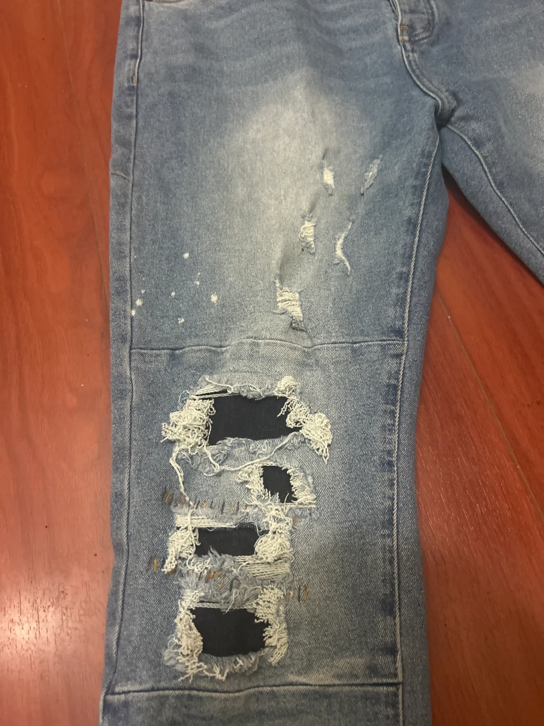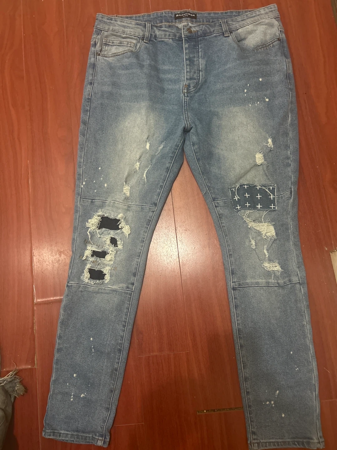 Selling a pair of Balenciaga Paris denim jeans. These jeans feature a distressed design with unique patchwork details. They're in good condition and ready for a new home!