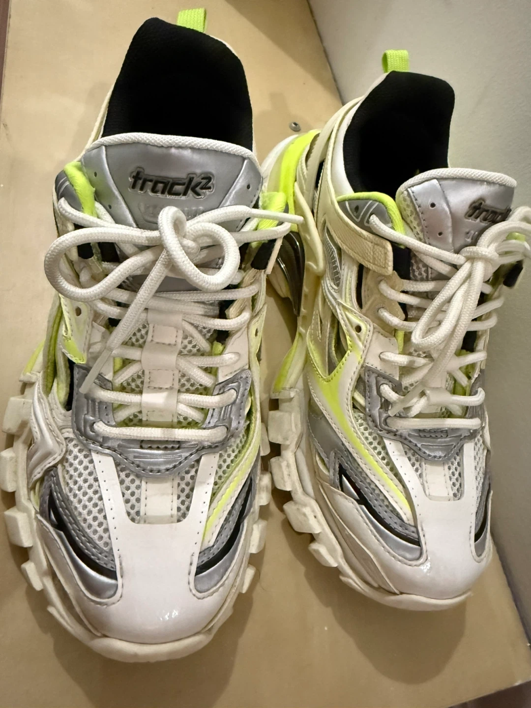 33Selling a pair of Balenciaga Track 2 sneakers. They feature a unique design with a mix of white, silver, and neon yellow accents. 38size, It fits very well if you wear sizes 36.5-37.5