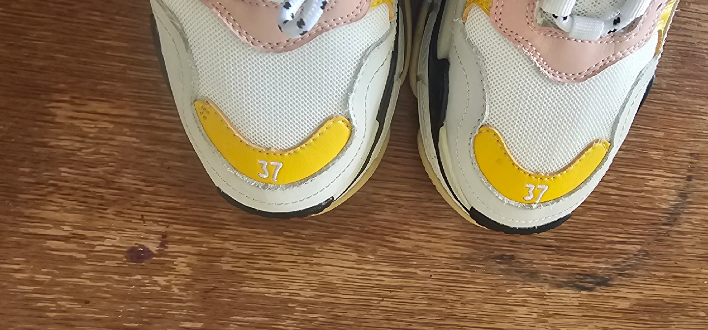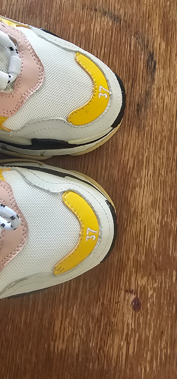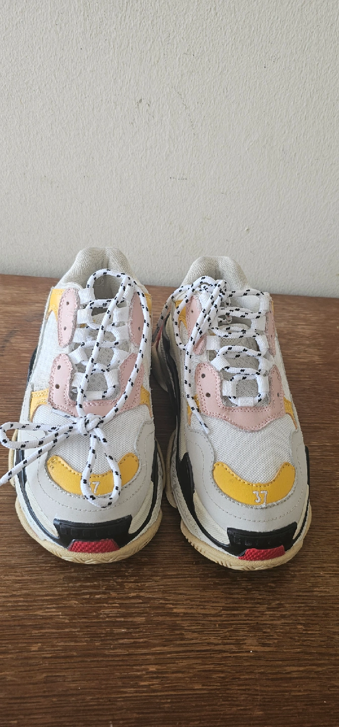 Selling a pair of Balenciaga Triple S sneakers in size 37. They feature a unique design with white, yellow, and pink accents. The shoes are in good condition and ready for a new home!