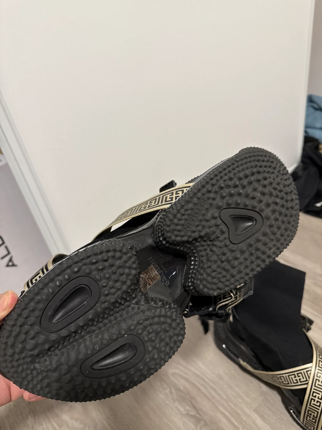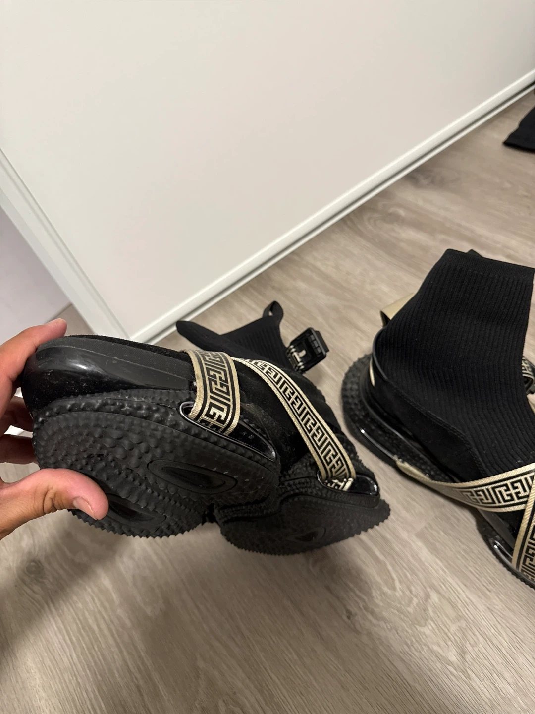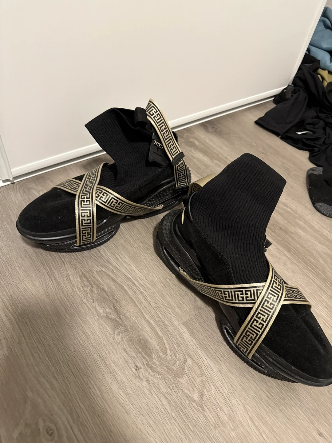 10Selling a stylish pair of Balmain knit high-top sneakers in black with gold accents. These shoes have a unique design and are in good condition. Perfect for adding a touch of luxury to your everyday look!