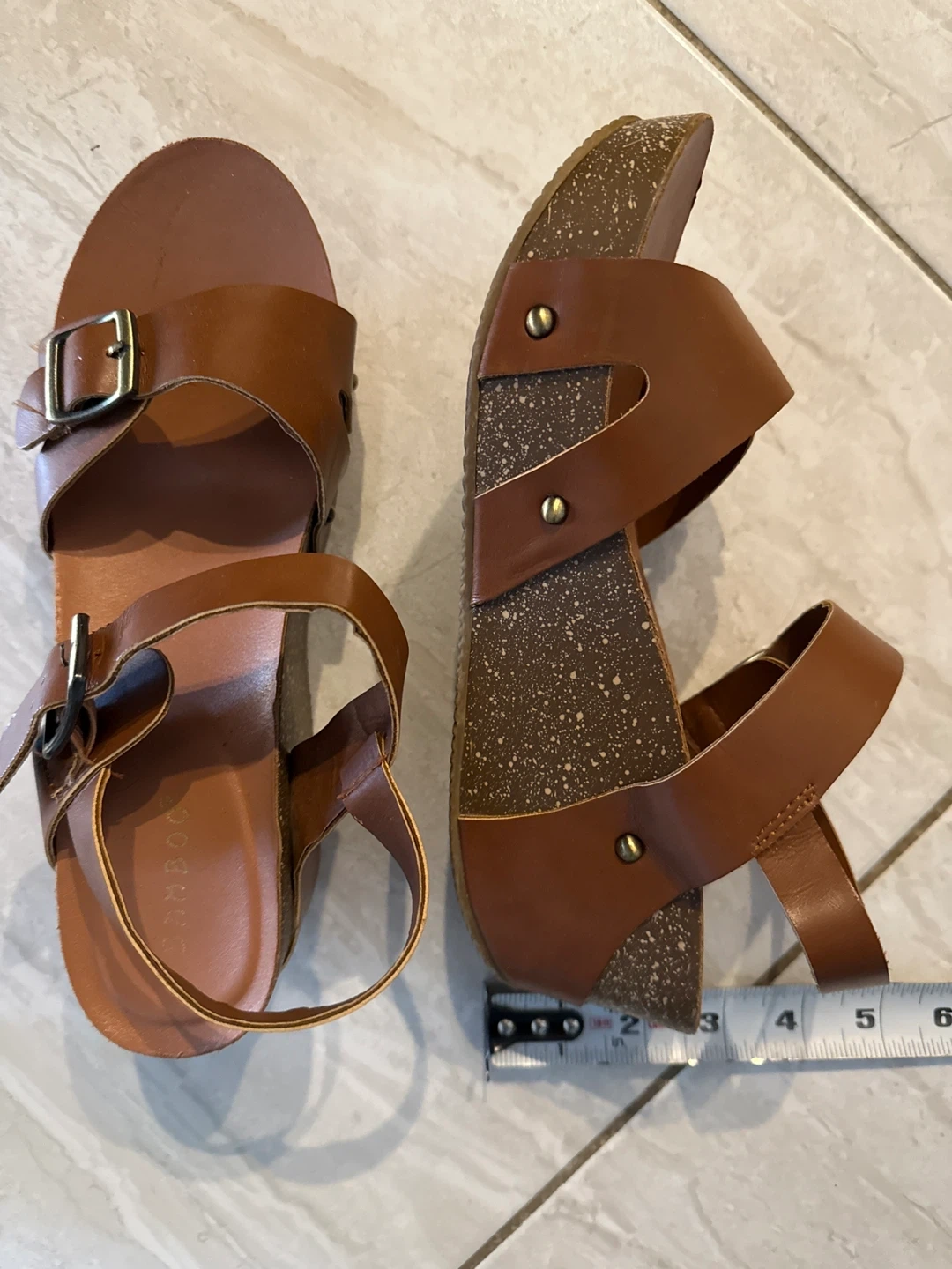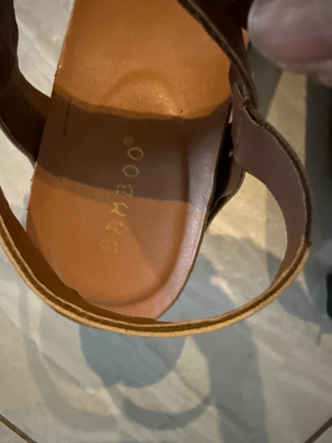 These are a pair of cute brown sandals from Bamboo! They appear to be a size 6.5 Curved sole makes it easy way to walk with 2.5 inche heels. Perfect for summer!