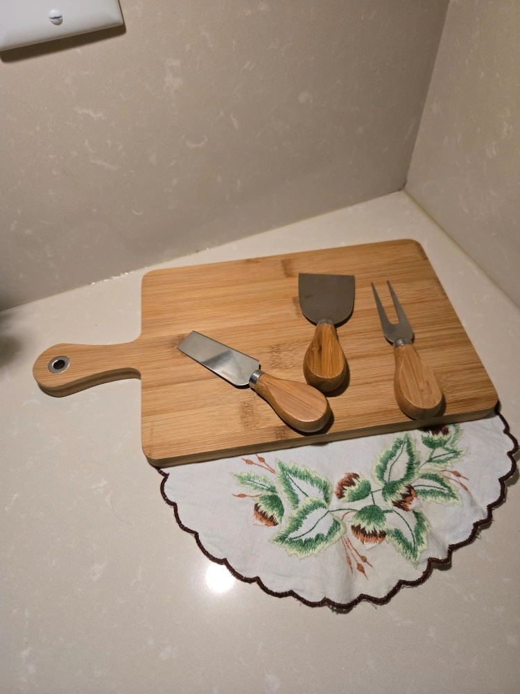 222Three piece cheese knife set. Includes spreader, knife, and fork. Wooden handles. Bamboo serving board. Perfect for cheese and crackers. Used only once.