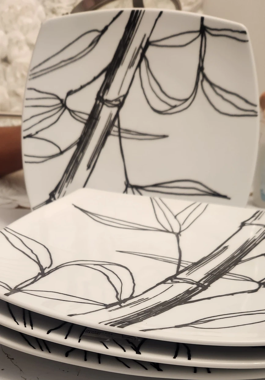 20Selling a set of four dinner plates featuring a stylish bamboo design. These plates are perfect for adding a touch of nature to your dining table. They're in great shape and ready for a new home!