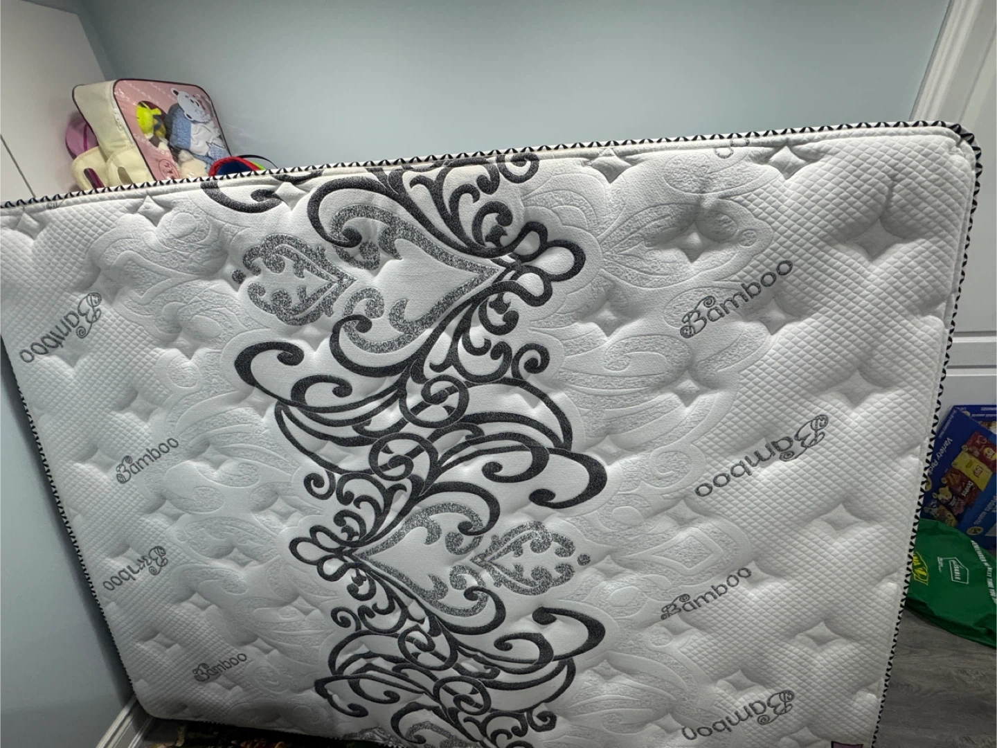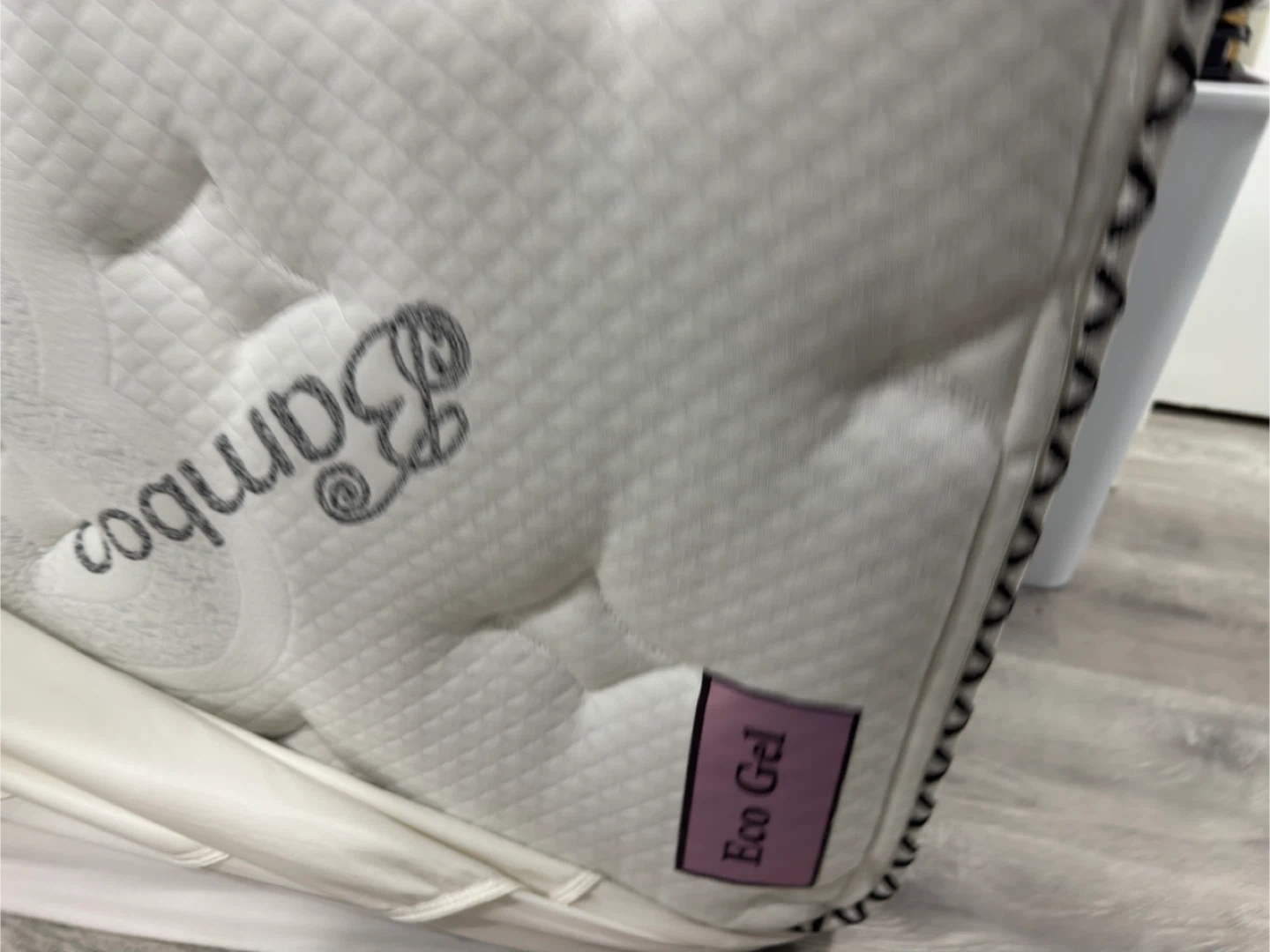 Selling a Bamboo Eco Gel mattress that offers great back support. It's in good condition and ready for a new home! The mattress has a unique design and is made with eco-friendly materials free bamboo made mattress protector 2 queen size pillow and duet In warranty of 10 year from Ritz furniture Open for offer
