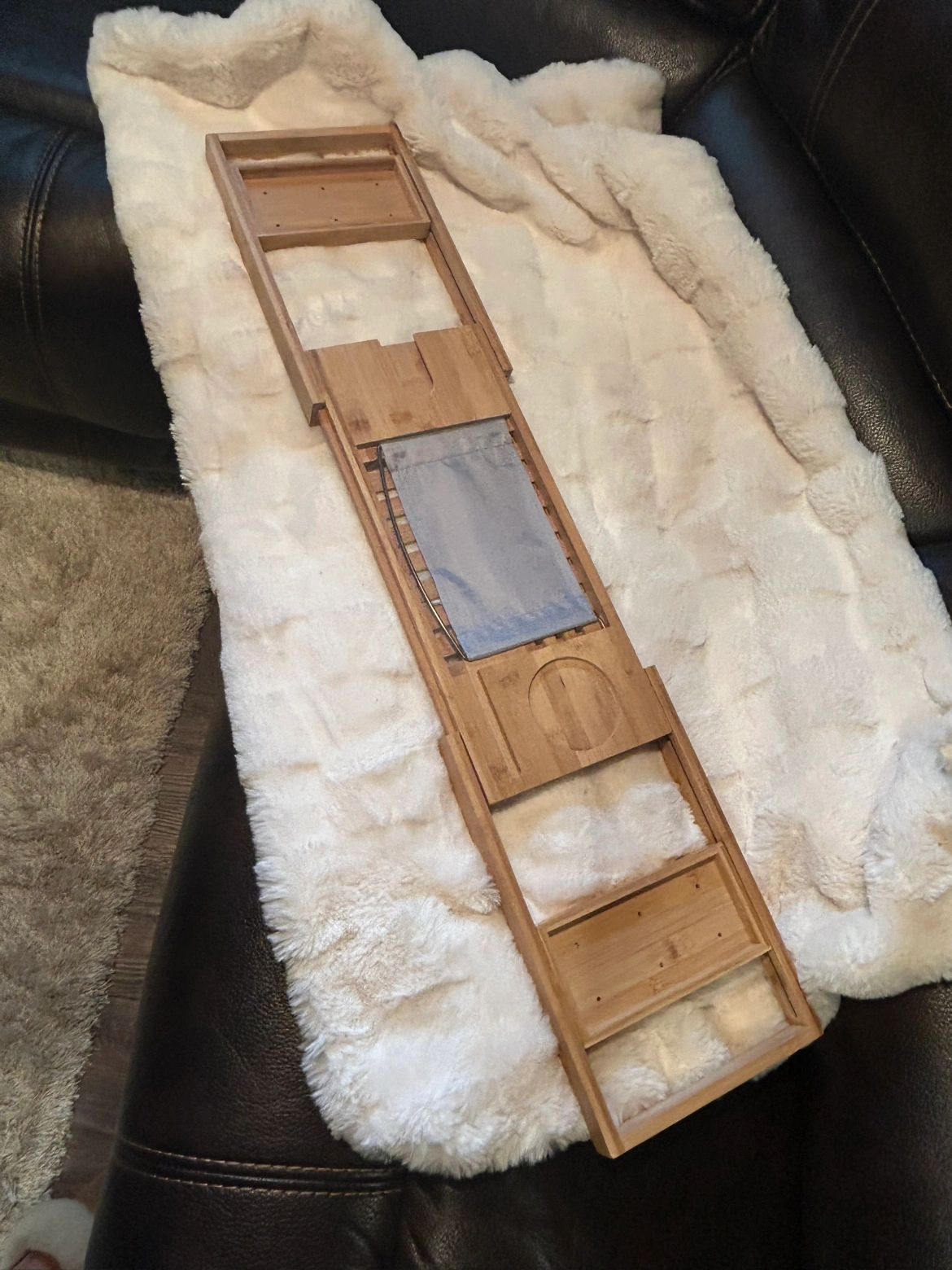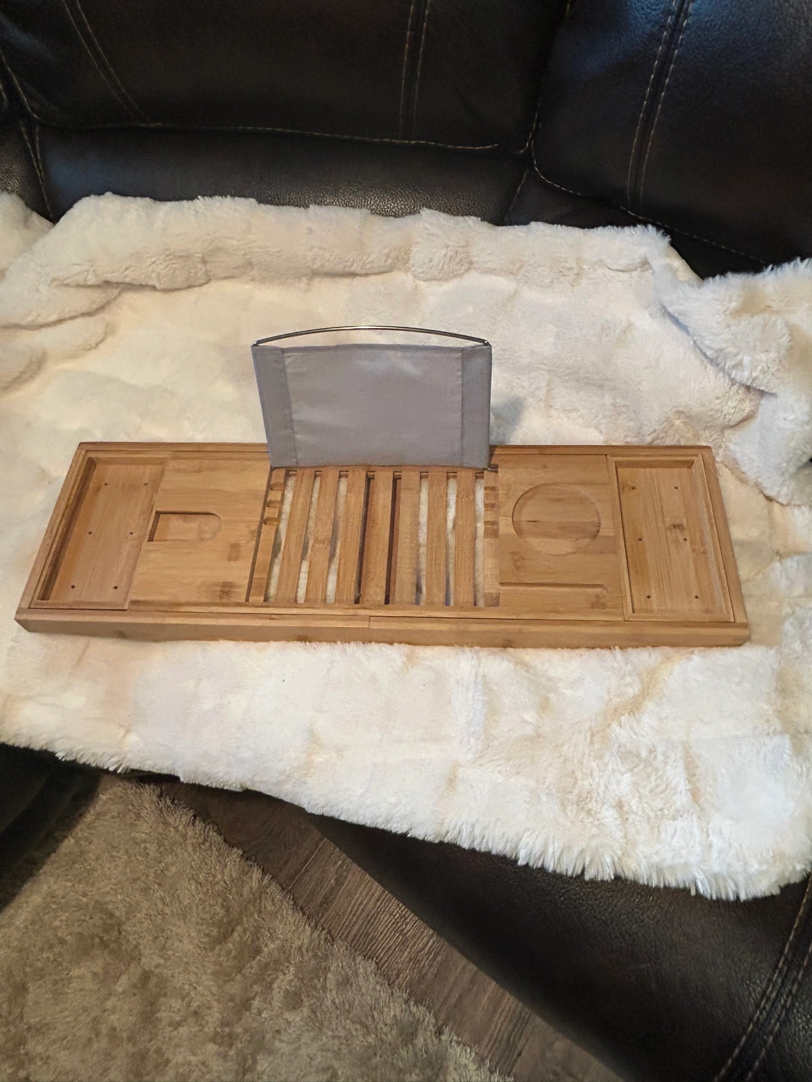 This is a bamboo expandable bathtub tray caddy. It's perfect for holding your book, phone, or a glass of wine while you relax in the tub. It's in great condition and ready for a new home!