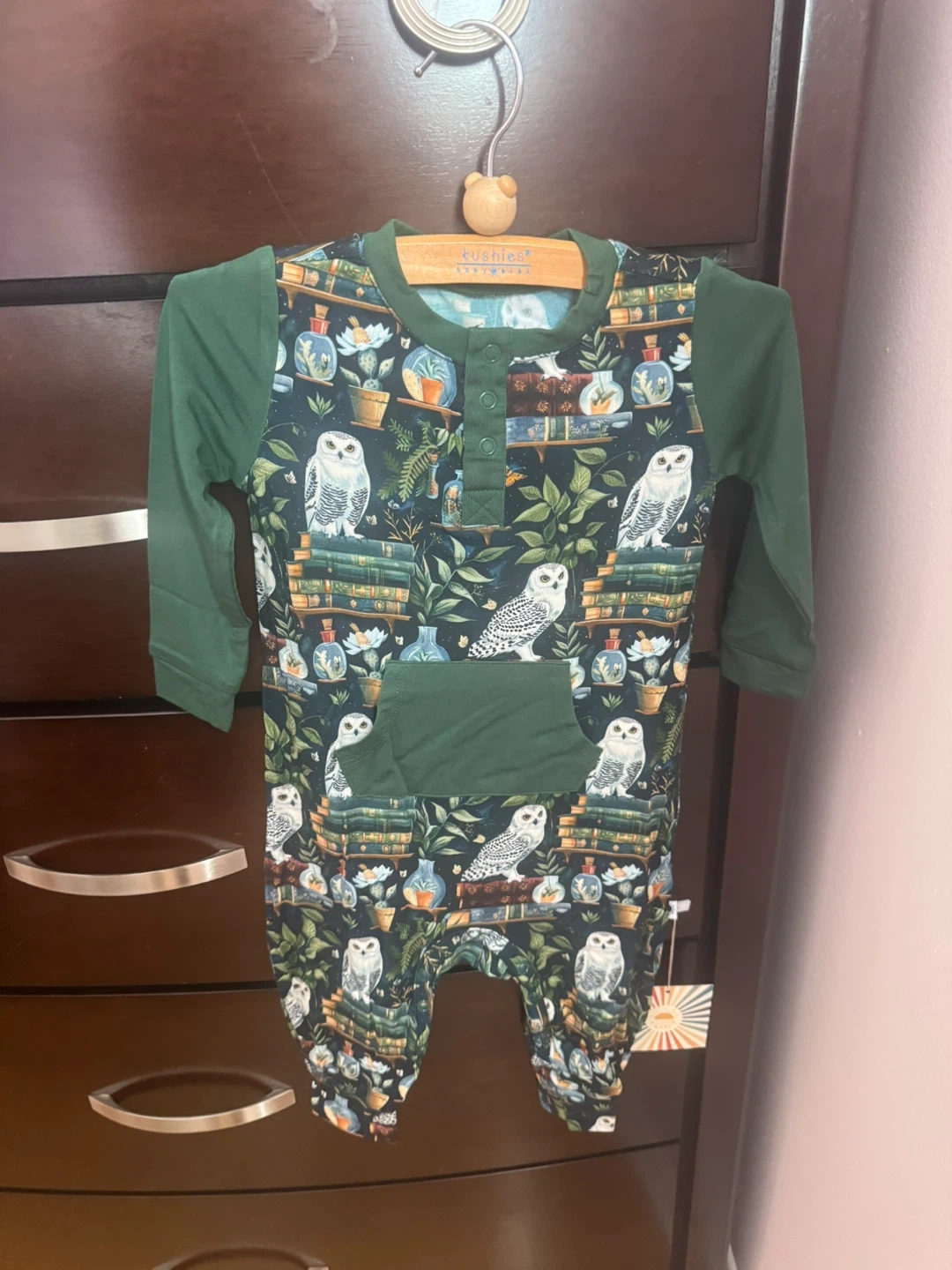 10This Bloom Baby Henley Romper is brand new and ready for a new home! It features a cute owl and bookshelf pattern. Size is 12-18 months, perfect for your little one's daywear wardrobe