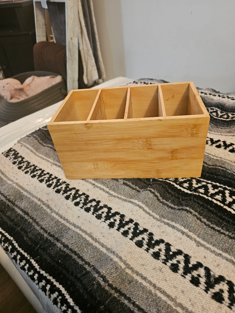 Wooden storage box. Three divided sections. Ideal for organizing desk supplies, toiletries, or craft materials. Lightweight and portable.