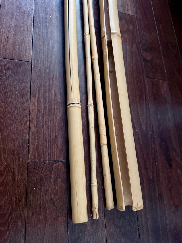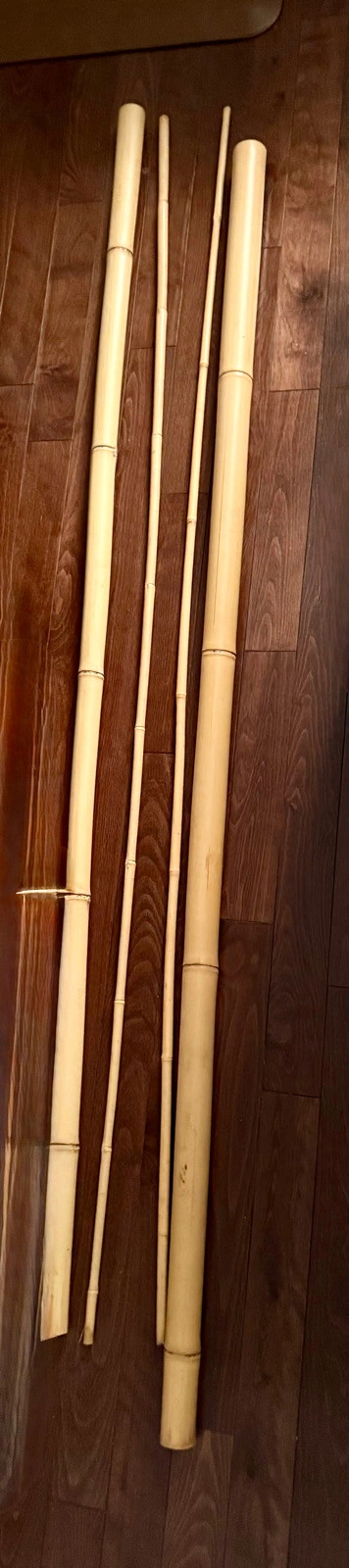 135These are used bamboo poles perfect for a number of uses. Each pole is about 80 inches long. This includes one full, uncut pole, and two poles that have been cut lengthwise. * Full Pole Length: Approximately 80 inches * Material: Bamboo Looking to add a touch of natural elegance to your space? These bamboo poles might be just what you need! Or, you know, use them for actual practical stuff. Get them before I decide to build a fort! Also, just a heads-up: if this ad is still up, the poles are still up for grabs!