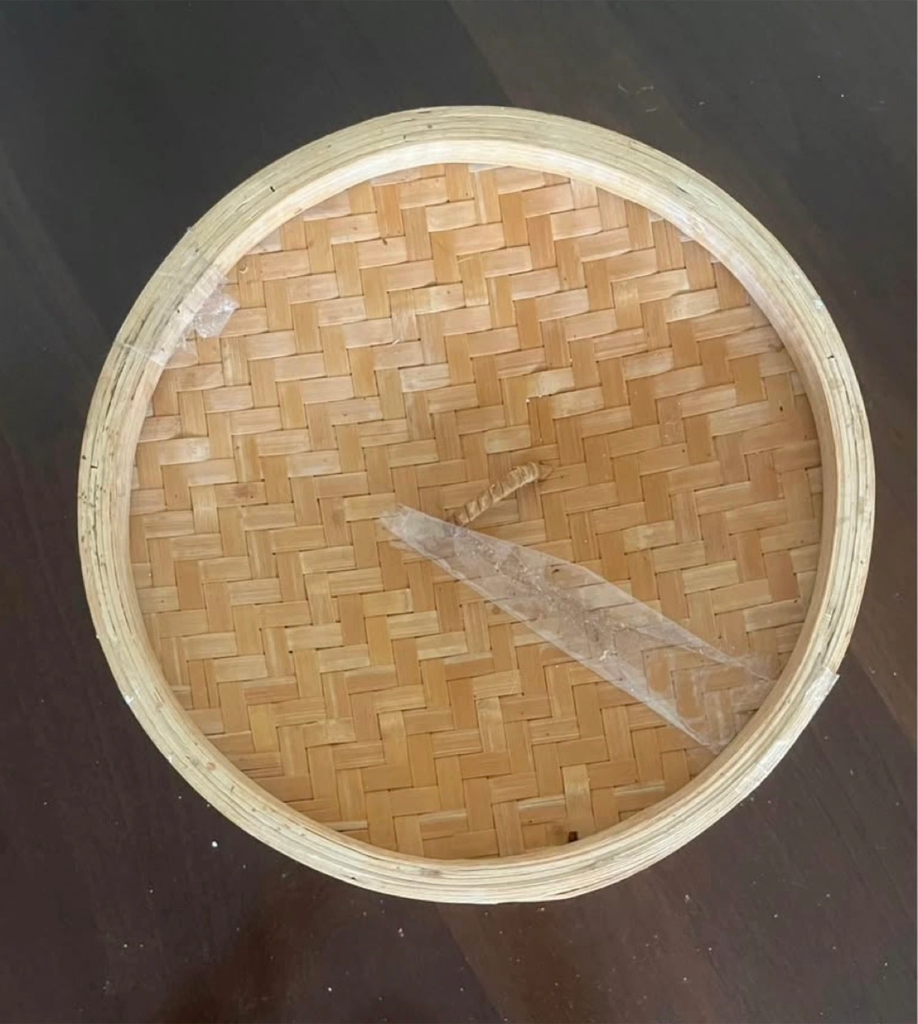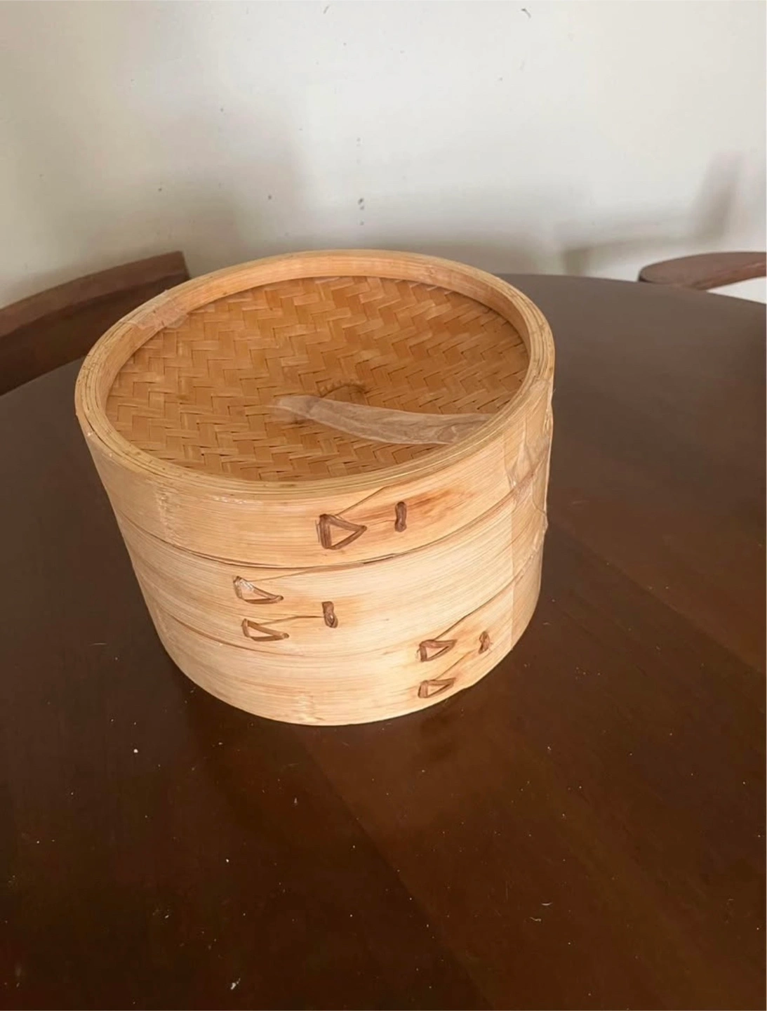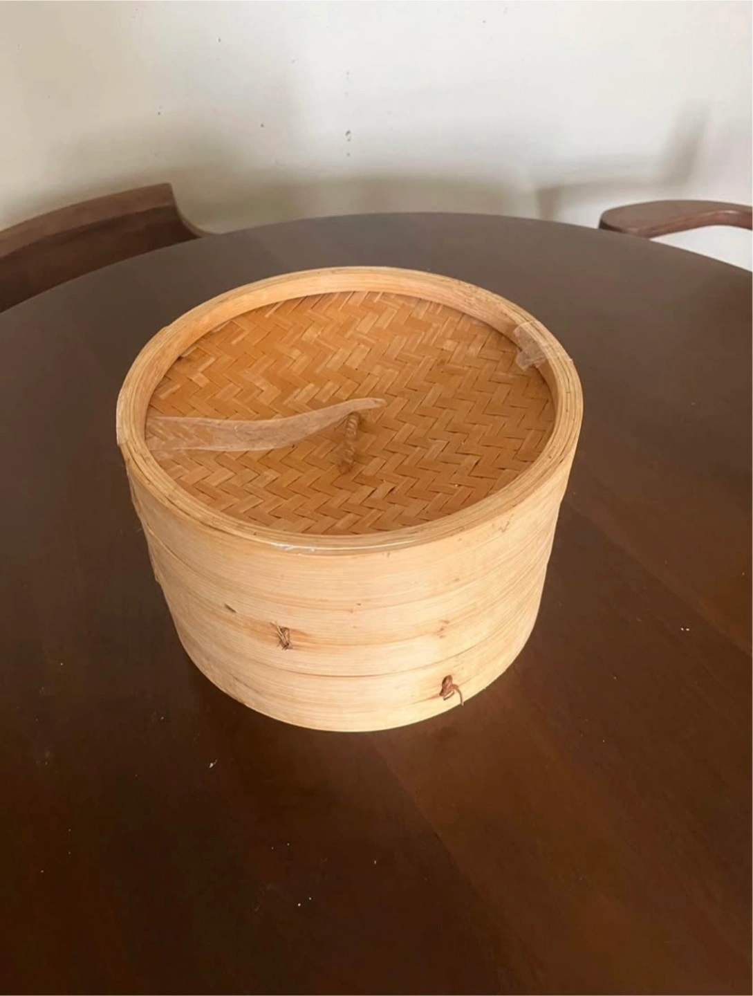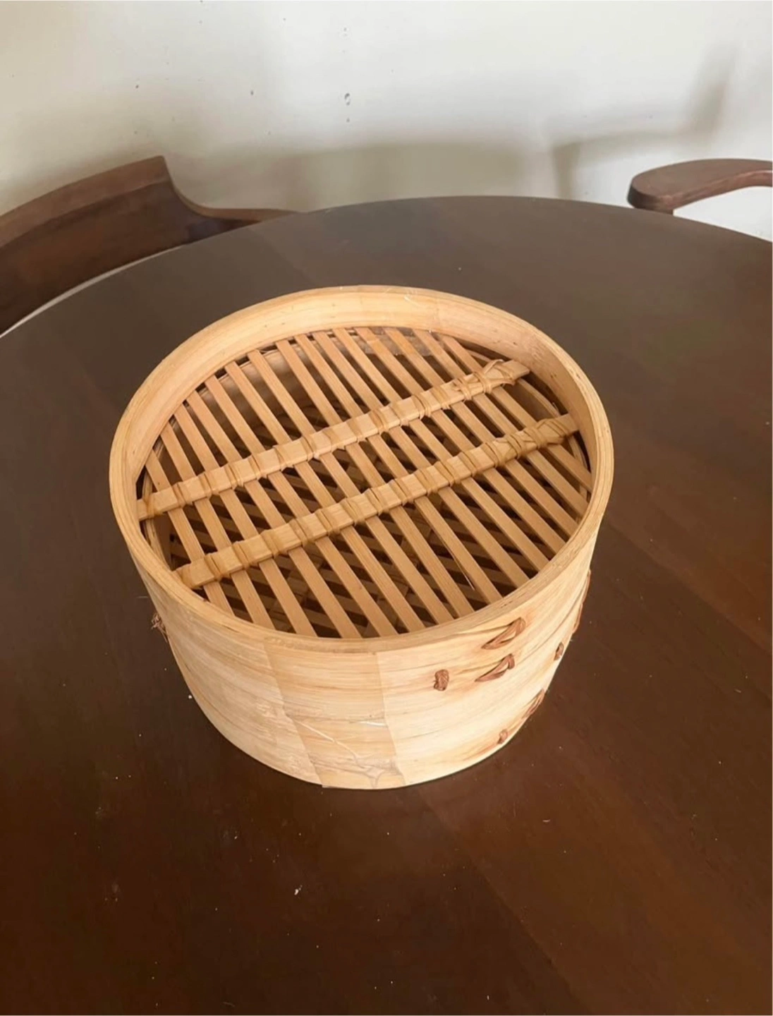 Selling a bamboo steamer basket in good condition. It's perfect for cooking dim sum, vegetables, and more. It has a natural, woven design.