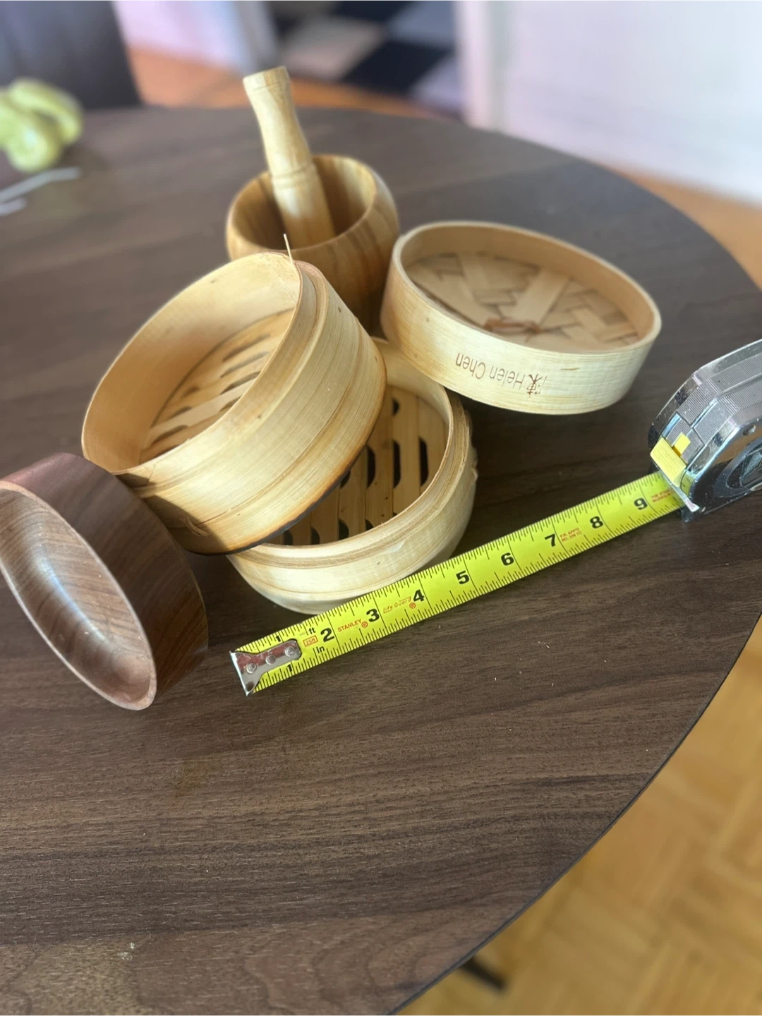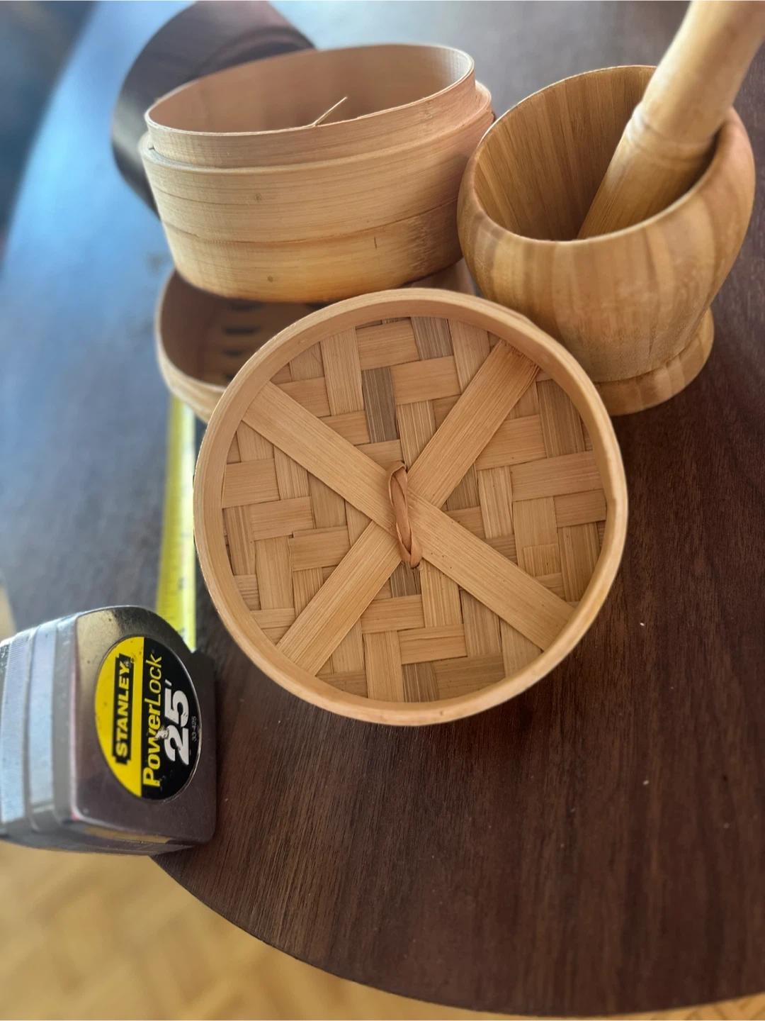 Selling a set of bamboo steamers, mortar and pestle, and a small wooden bowl. The steamers are great for cooking dim sum or other steamed dishes. The mortar and pestle is perfect for grinding spices or herbs. The bowl is a nice addition for serving food. All items are in excellent condition and ready for a new home