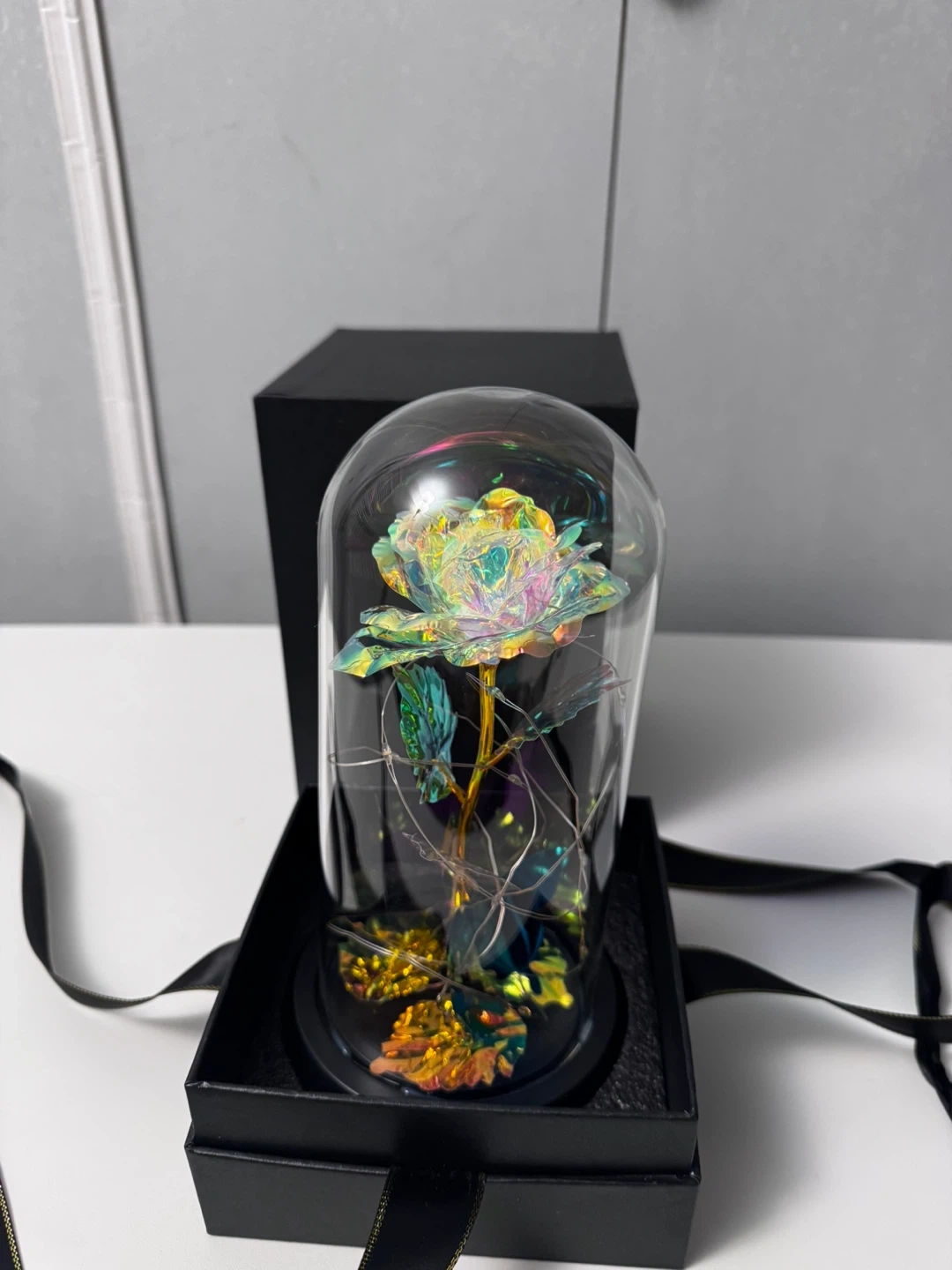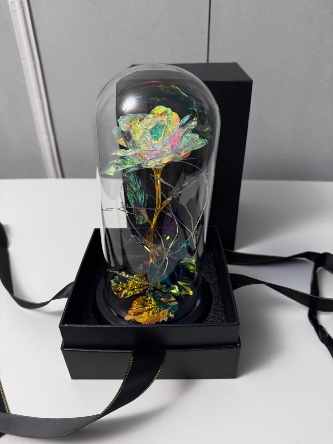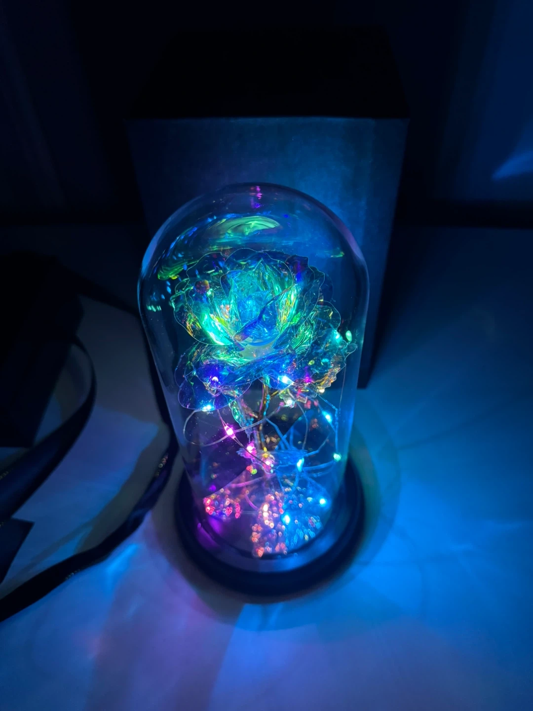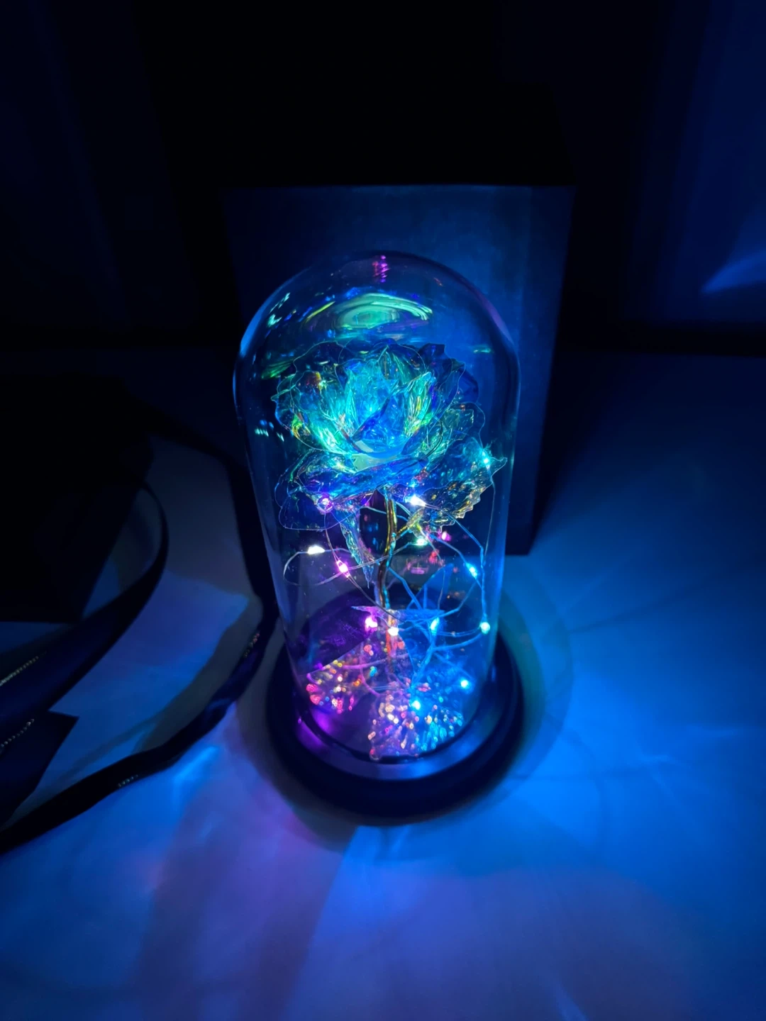 This decorative dome features a galaxy-patterned rose with embedded LED string lights. It comes in a black gift box with a ribbon closure. Perfect for adding a touch of sparkle to any room! Great for valentines gifts or birthday, mother’s gift. Batteries are not included in this.