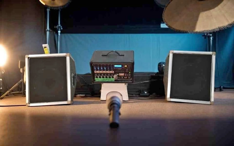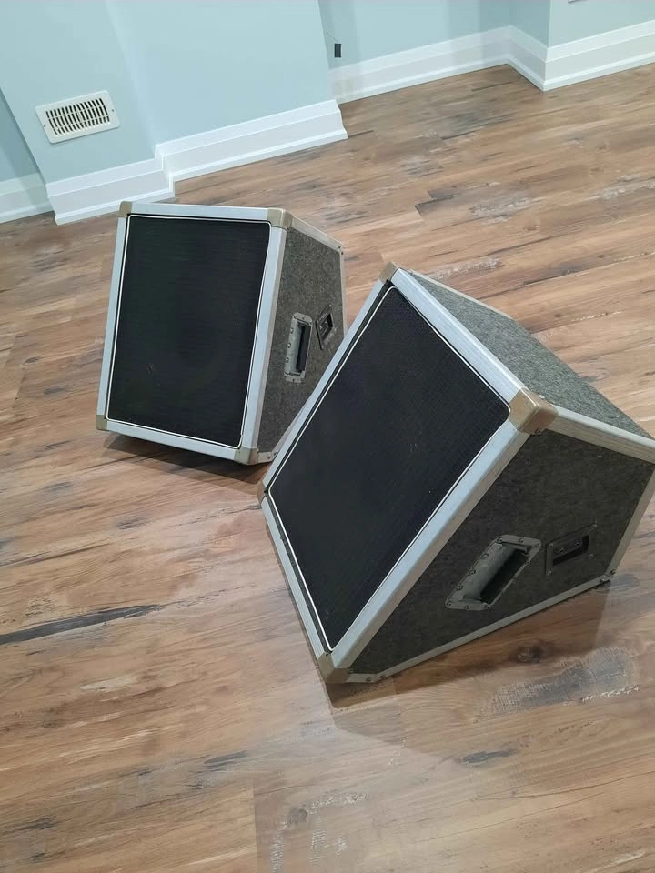 76Large heavy stage monitors x 2. 10 inch speakers, 6 inch horn. 38 lbs each, 21 x 17 x 20 inches. They are very very loud and strong sounding. Says Heywood but I haven't found info on them. I think they were custom made.