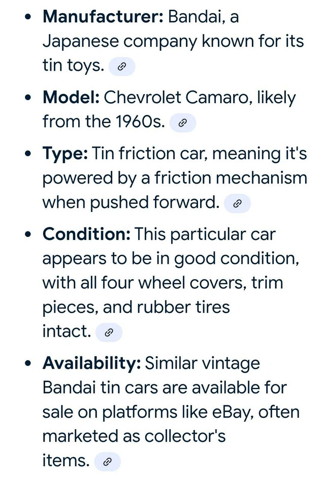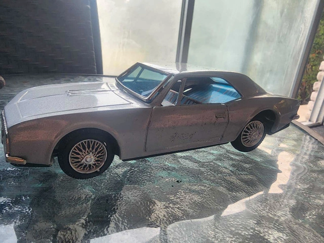 This is a vintage Bandai Chevrolet Camaro toy car, made in Japan. It's a charming piece with a silver exterior and blue tinted windows. Given its age, it shows some wear, which adds to its vintage appeal. It could be a great addition to a collection or a unique display piece. It's still available if you're seeing this ad – no need to ask!