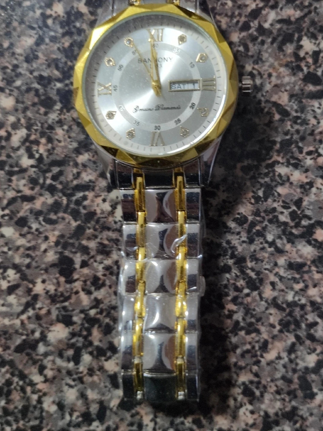 10Selling a BANYONY wrist watch featuring a two-tone design. The watch has a silver face with gold accents and a two-tone band. It displays the day and date.
