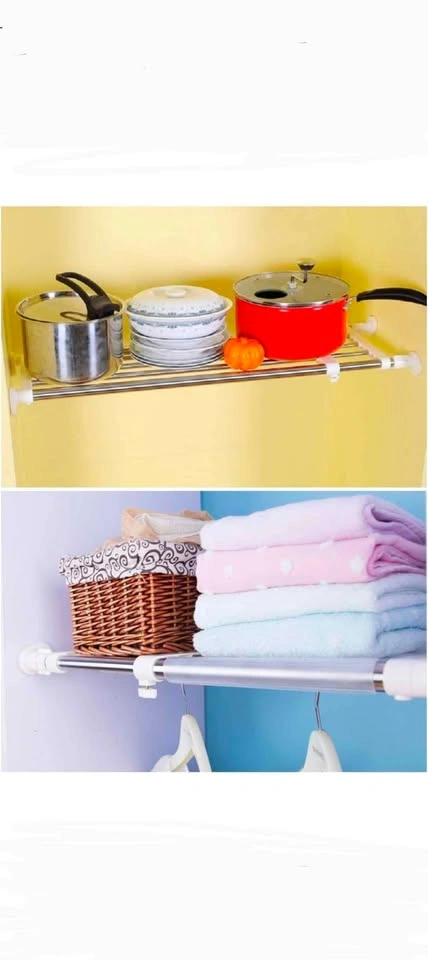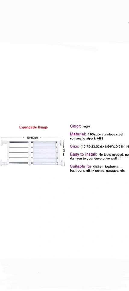 10Brand new in the box. Adjustable storage shelf rack, use for wardrobe / closet dividers, for kitchen, bedroom, bathroom, utility rooms, garages, etc. It can be installed in any place suitable for this size. Easy to install: No tools needed, no damage to your decorative wall. Just adjust to the length you want within the expandable range, and select strong sides, such as tiles, walls, wardrobes, shoe racks, cabinets, refrigerator, or bookcase compartment. Heavy duty: It can load 20kg, meeting storage needs. You can use it to put clothes, scarves, belts, plants, flower pots, shoes, books and so on. Material: 430/spcc stainless steel composite pipe & ABS; Color: Ivory Size:(15.75-23.62)Lx9.84Wx0.59H IN, you can expand the length freely within the expandable range.