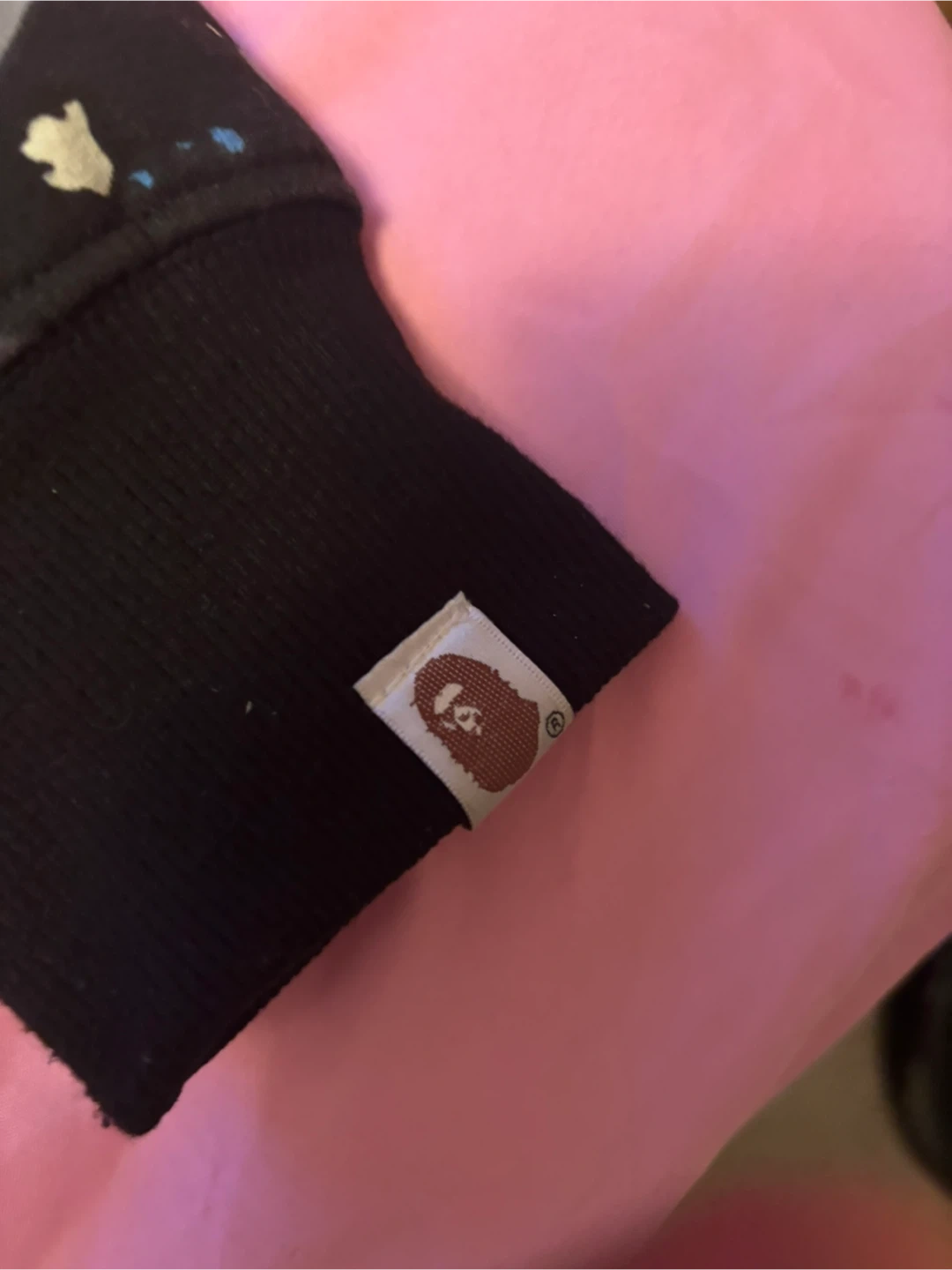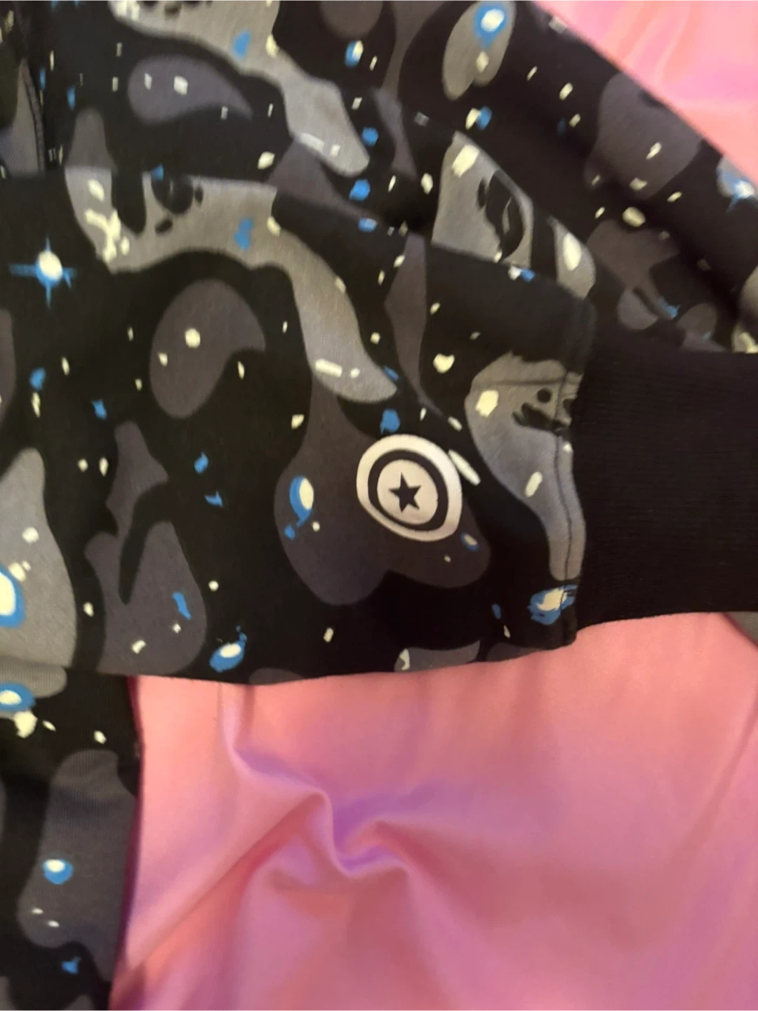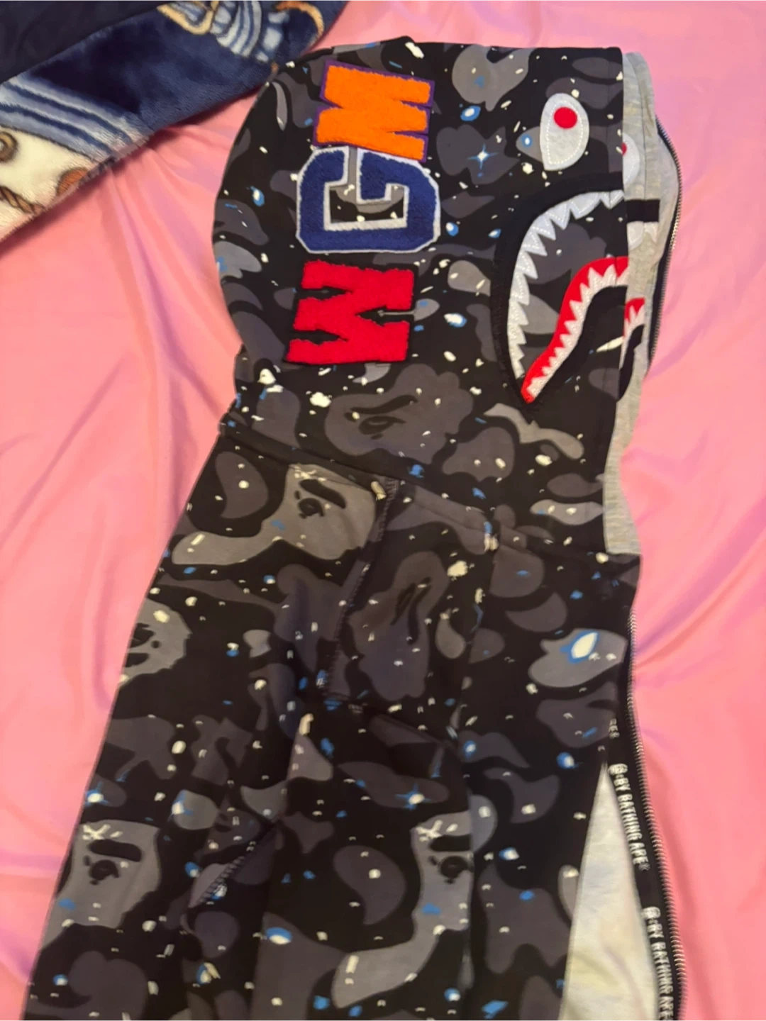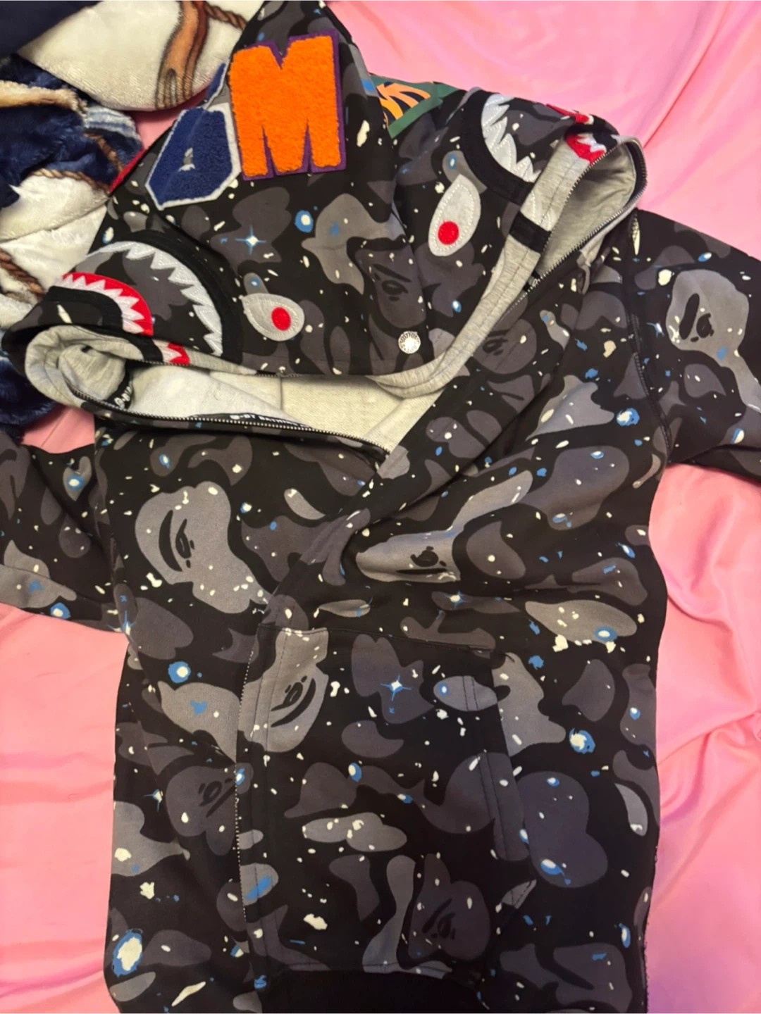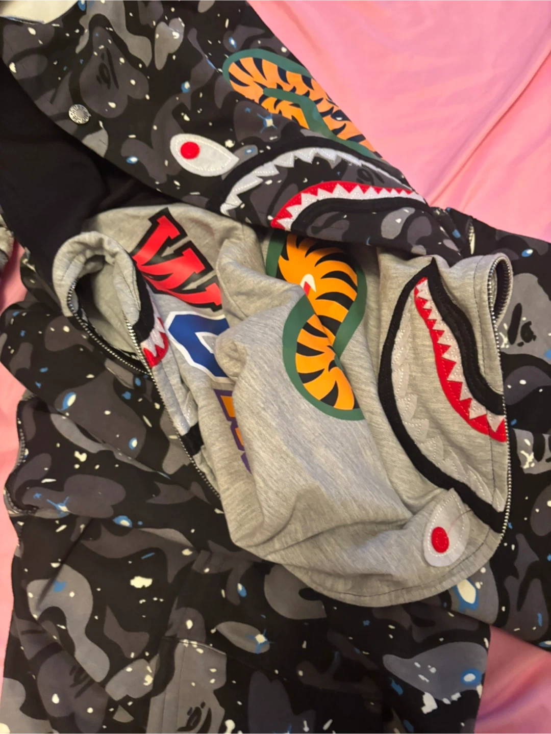 26Selling a BAPE full zip hoodie. It features a unique camo pattern and the iconic BAPE shark design on the hood. Perfect for adding a statement piece to your wardrobe!