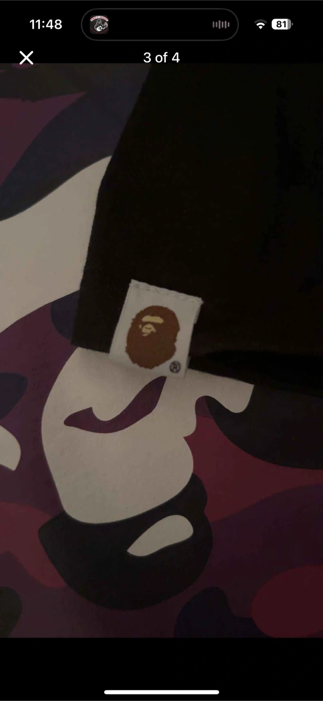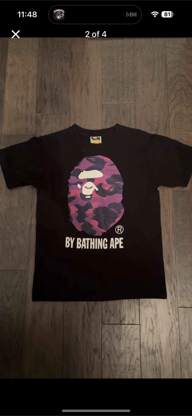 18A Bathing Ape T-shirt in size small. The shirt is black with a purple camo ape design on the front. The tag is visible and shows the BAPE logo.