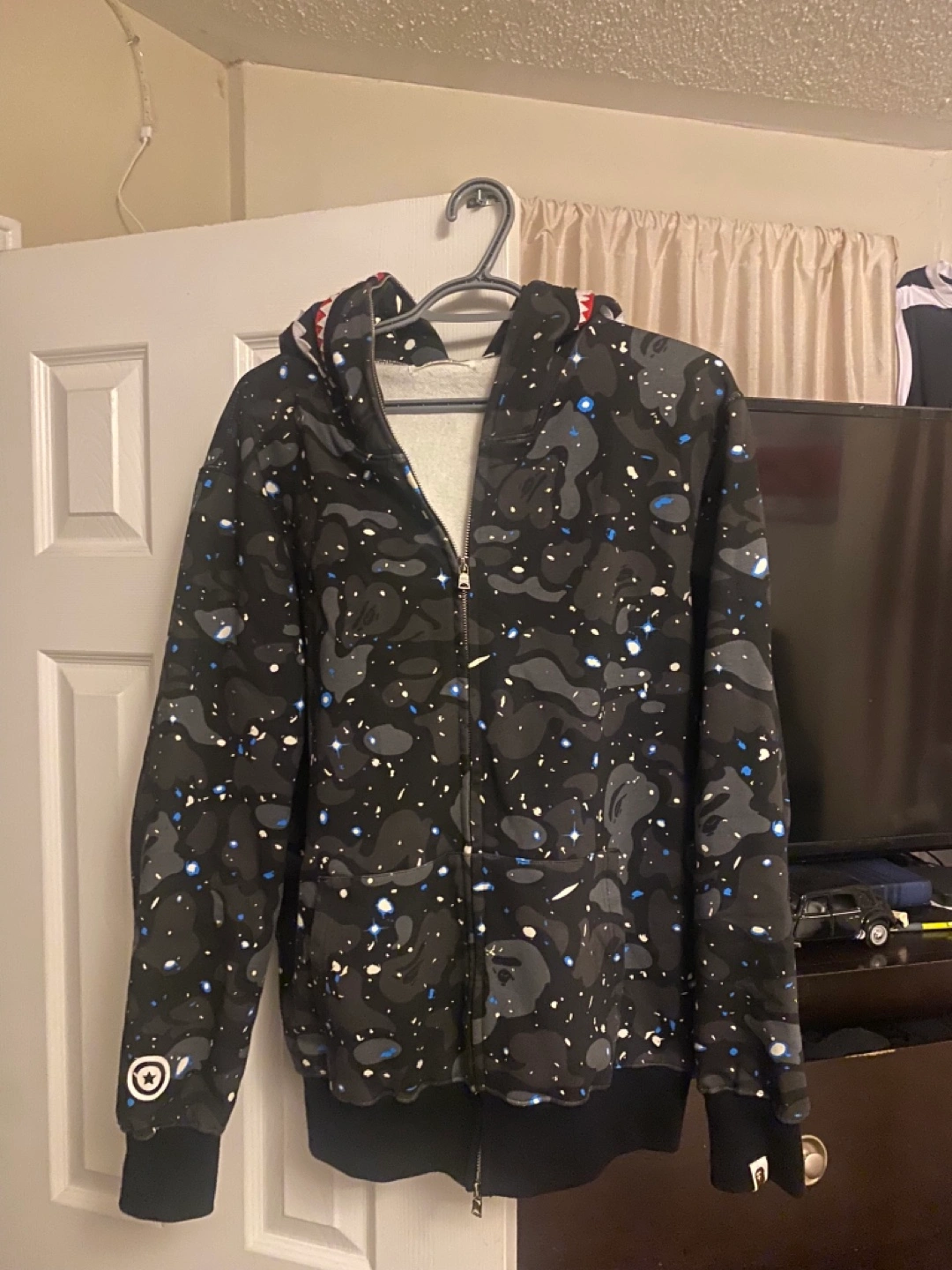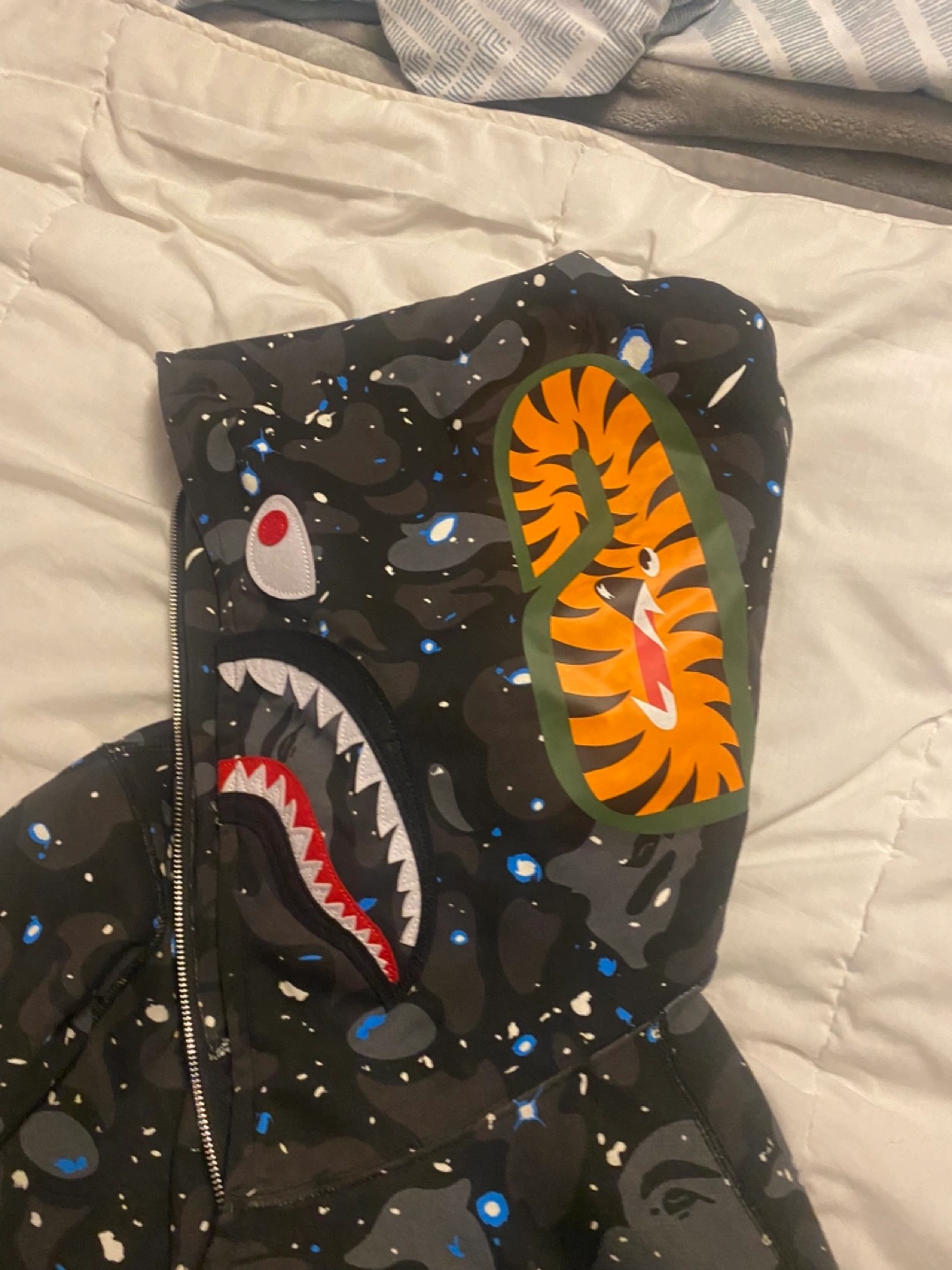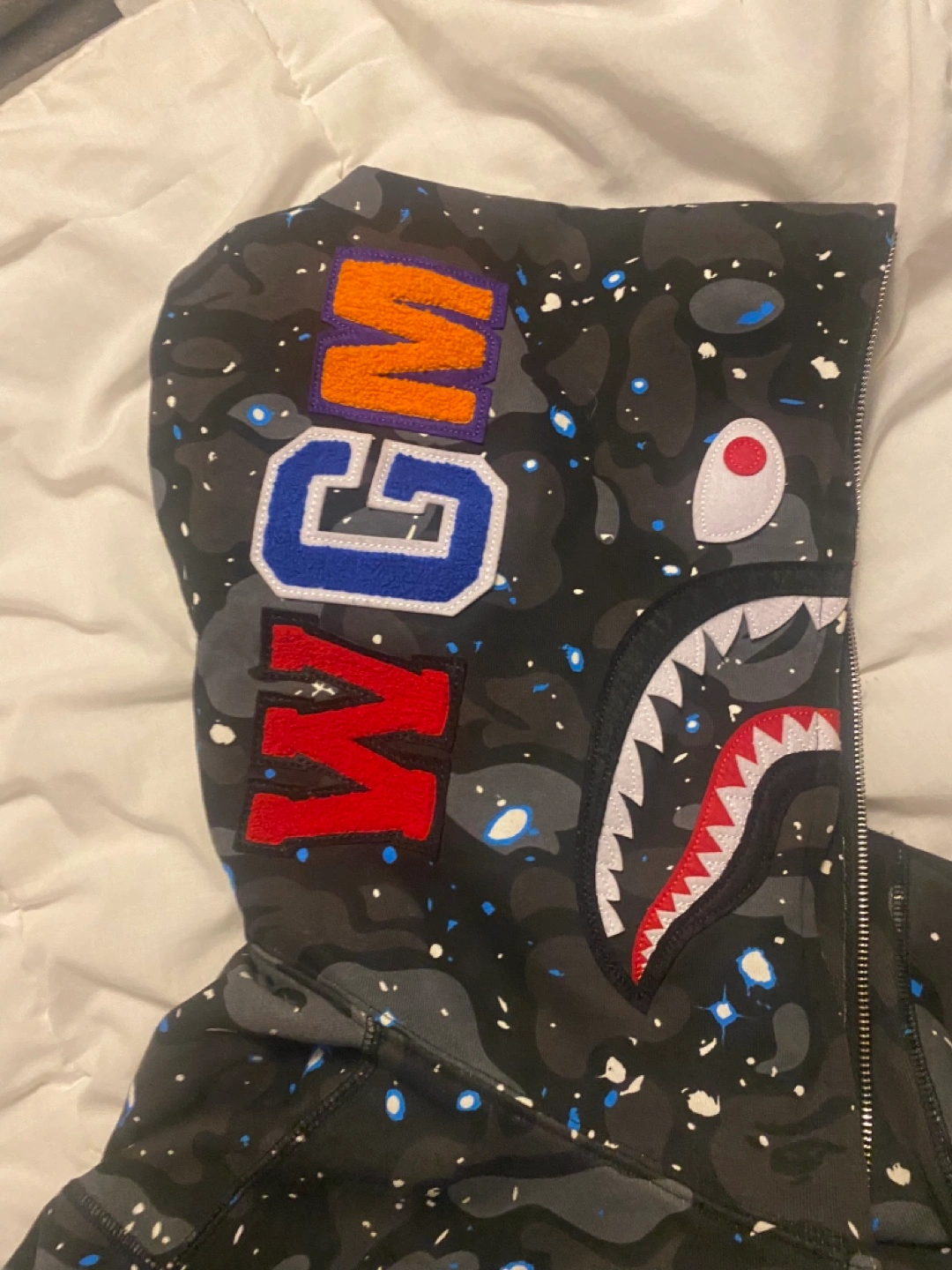 10Selling a BAPE full zip hoodie in black camo! It features the iconic shark design on the hood with a tiger graphic and 'WGM' lettering. Great for adding a unique touch to your wardrobe!