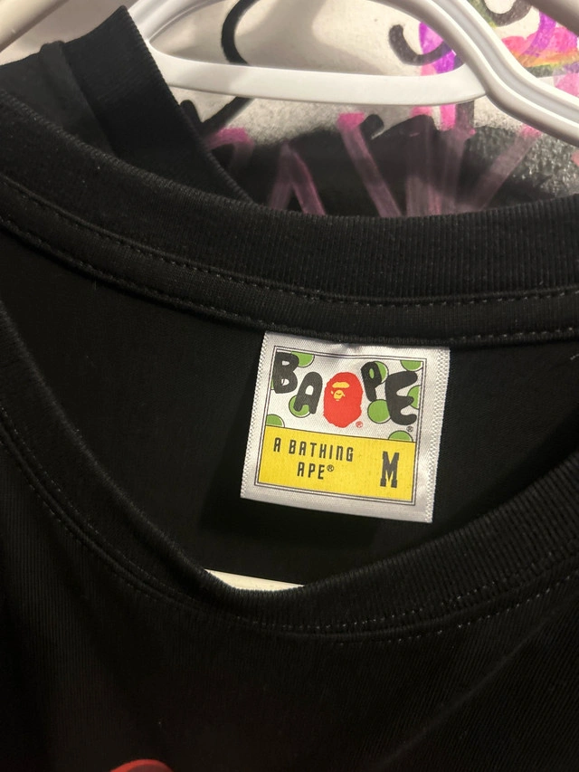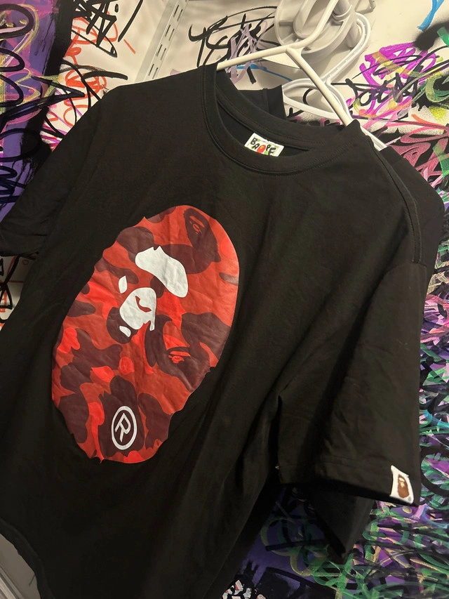 21Authentic BAPE tee featuring the classic red camo Ape Head logo. Size Medium – fits true to size. Black colourway with red camo graphic and BAPE sleeve tag. Good condition, no rips or stains. 100% authentic, from official A Bathing Ape drop.