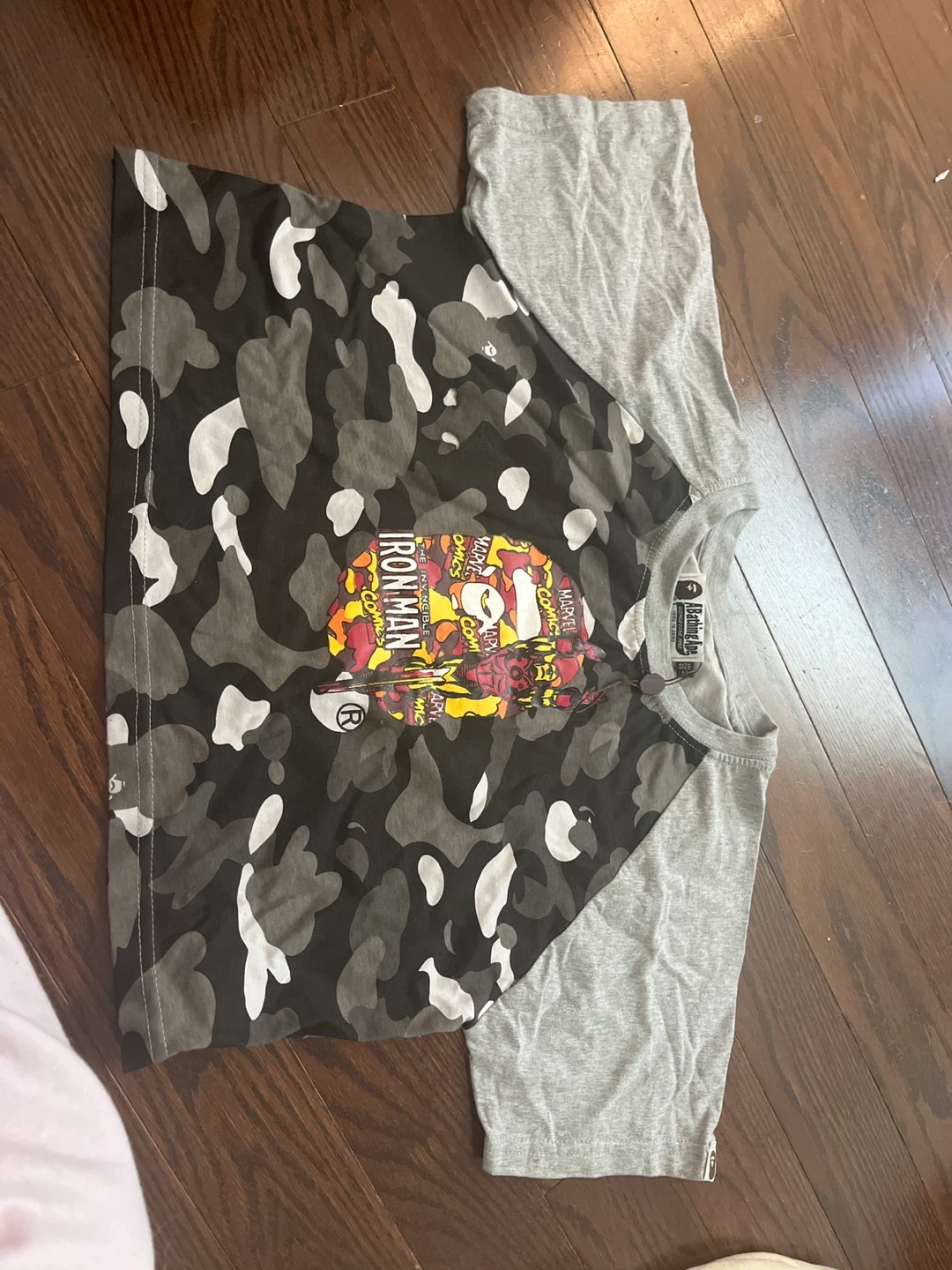 10Selling a BAPE (A Bathing Ape) x Marvel Iron Man camo raglan t-shirt! It features a cool camo pattern with an Iron Man graphic. The sleeves are a contrasting grey colour. Perfect for any Marvel or BAPE fan!