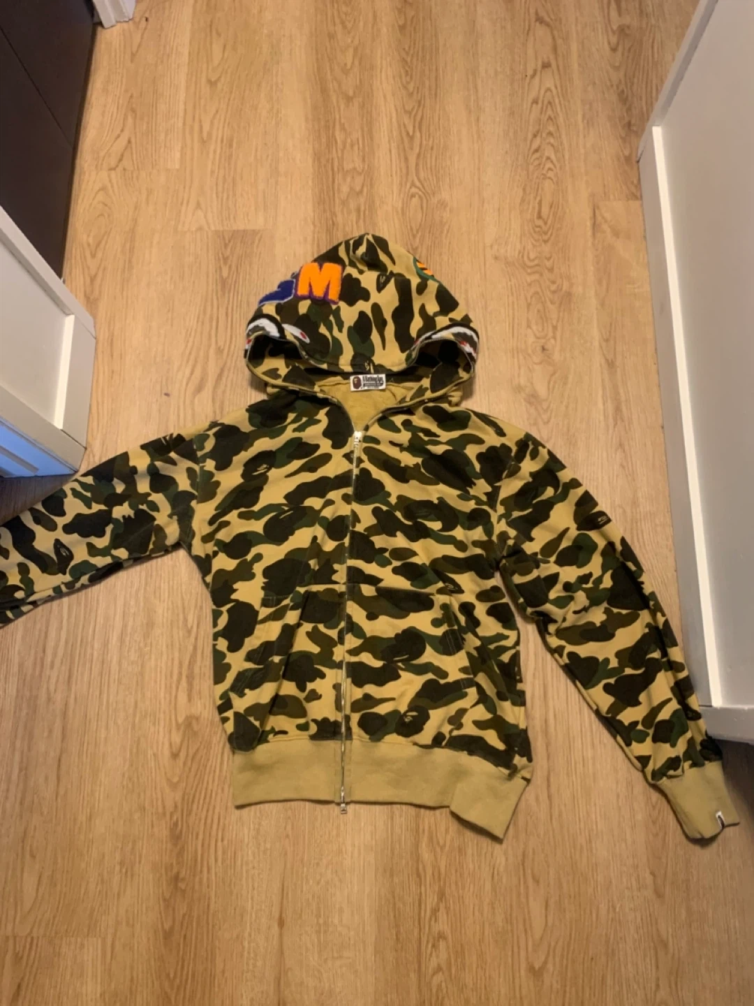 10Selling a BAPE full zip hoodie in a yellow camo print! It's in good condition and ready for a new home. The iconic shark design on the hood adds a unique touch to this streetwear staple