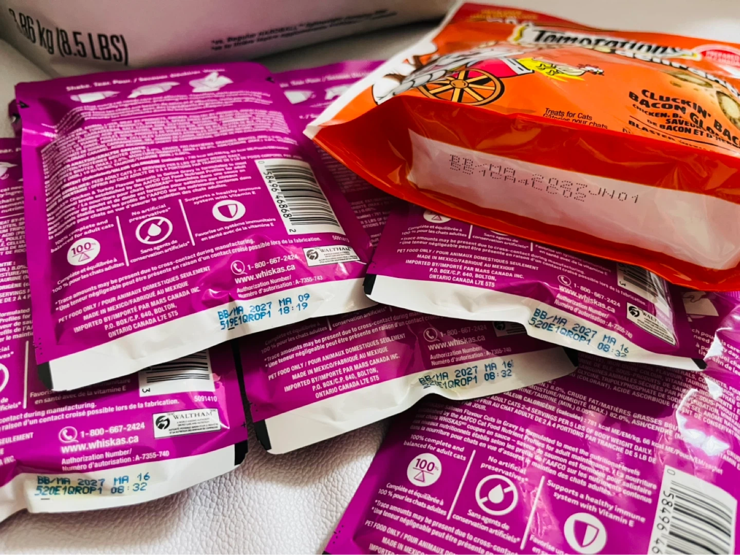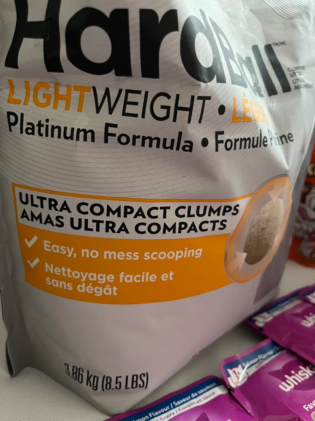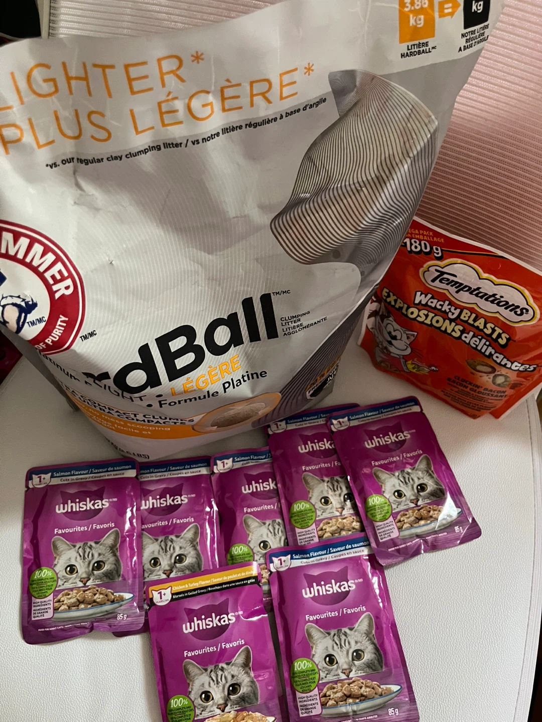 1 bags of ARM & HAMMER Hardball Clumping Litter 3.86kg and 7bags of cat foods 85g/ea +1 Temptations cat treats
