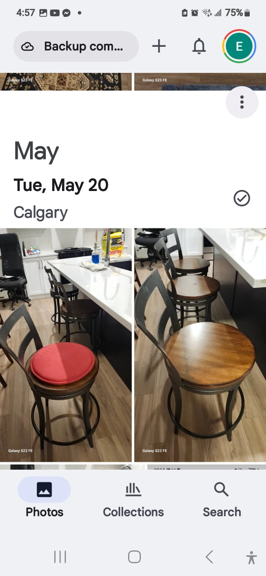 Selling a set of three bar stools. They have a rustic look with metal frames and wooden seats. One of the stools has a red cushion on top for added comfort. Great for a kitchen island or bar area!