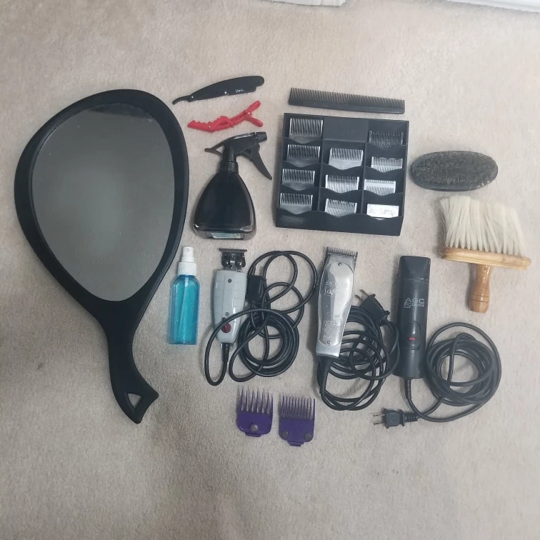 Selling a set of barber and haircutting tools. Includes clippers, guards, mirror, brushes, and other accessories as pictured. Great for professional, home or mobile use...Selling cheap just to get rid of them !!! Blades alone sell for more than the whole kit !!