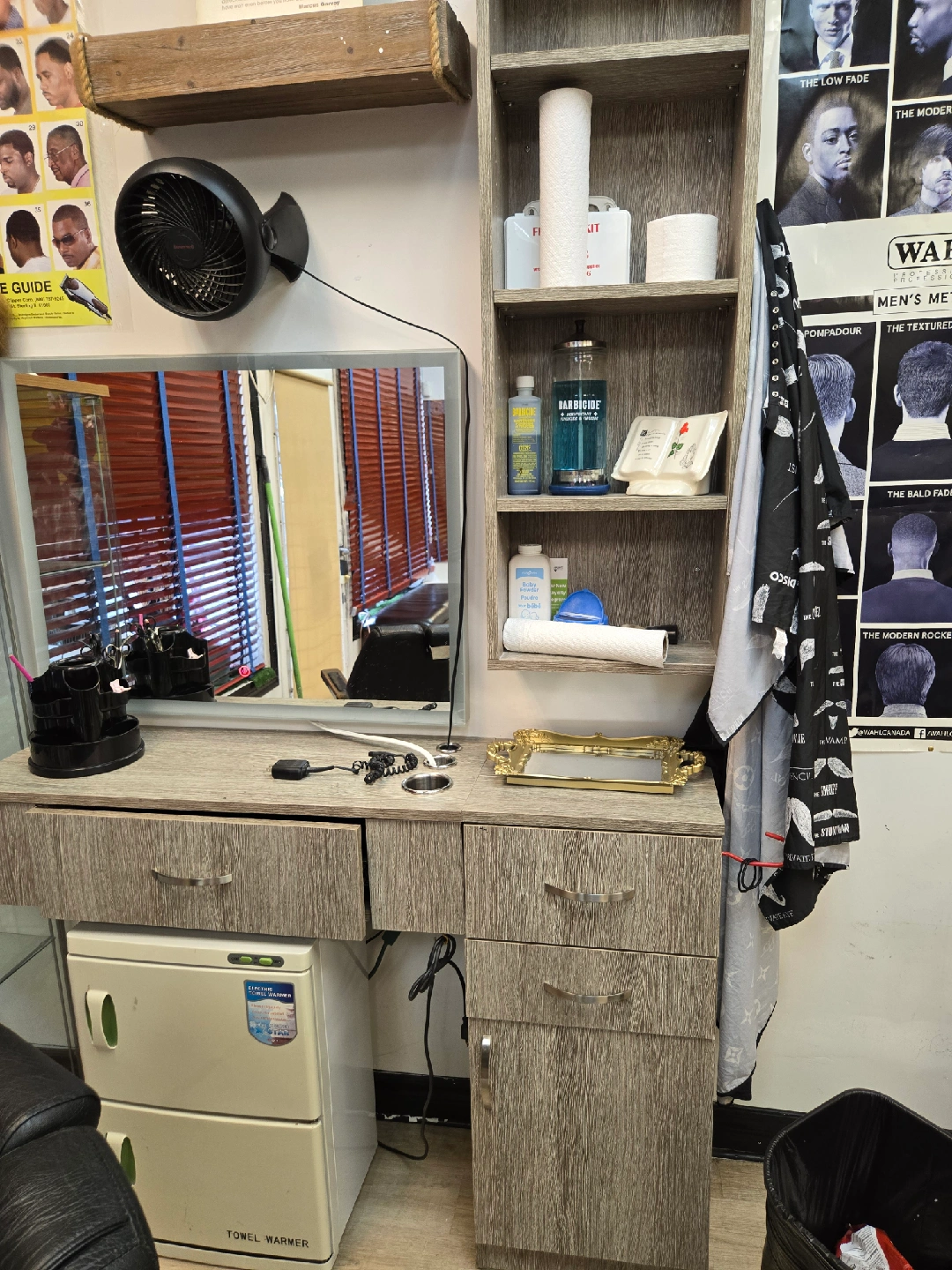 Selling a barber shop station. It features a cabinet with drawers and shelves for storage. There is also a mirror and space for tools. Perfect for a barber or stylist looking to set up their own station