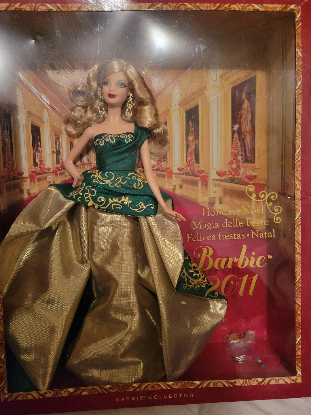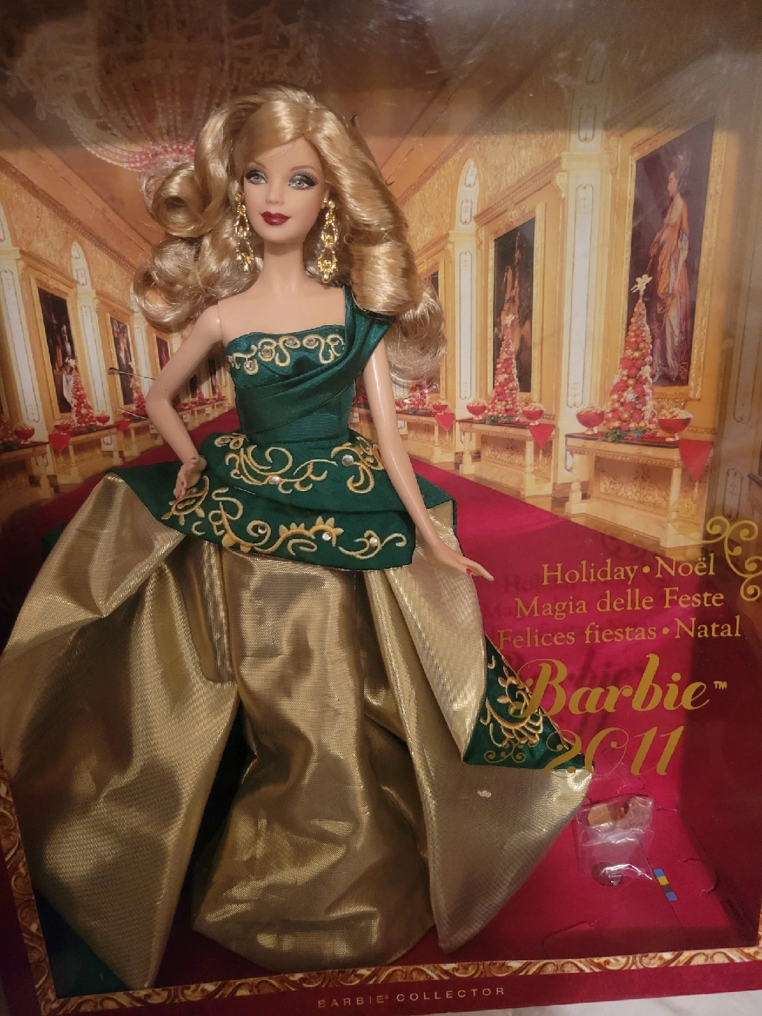 48Selling a brand new, in-box 2011 Holiday Barbie doll! This beautiful doll is part of the Barbie Collector series and features a stunning green and gold gown. It's a perfect addition to any Barbie collection.