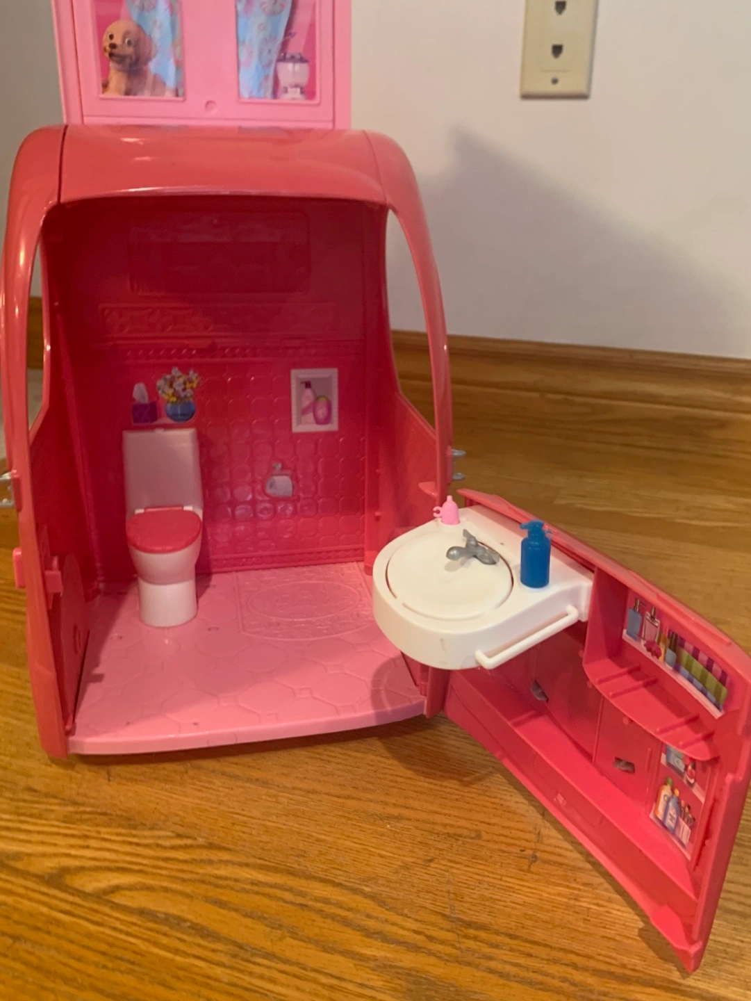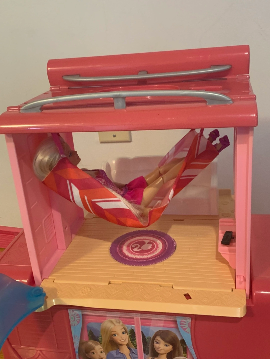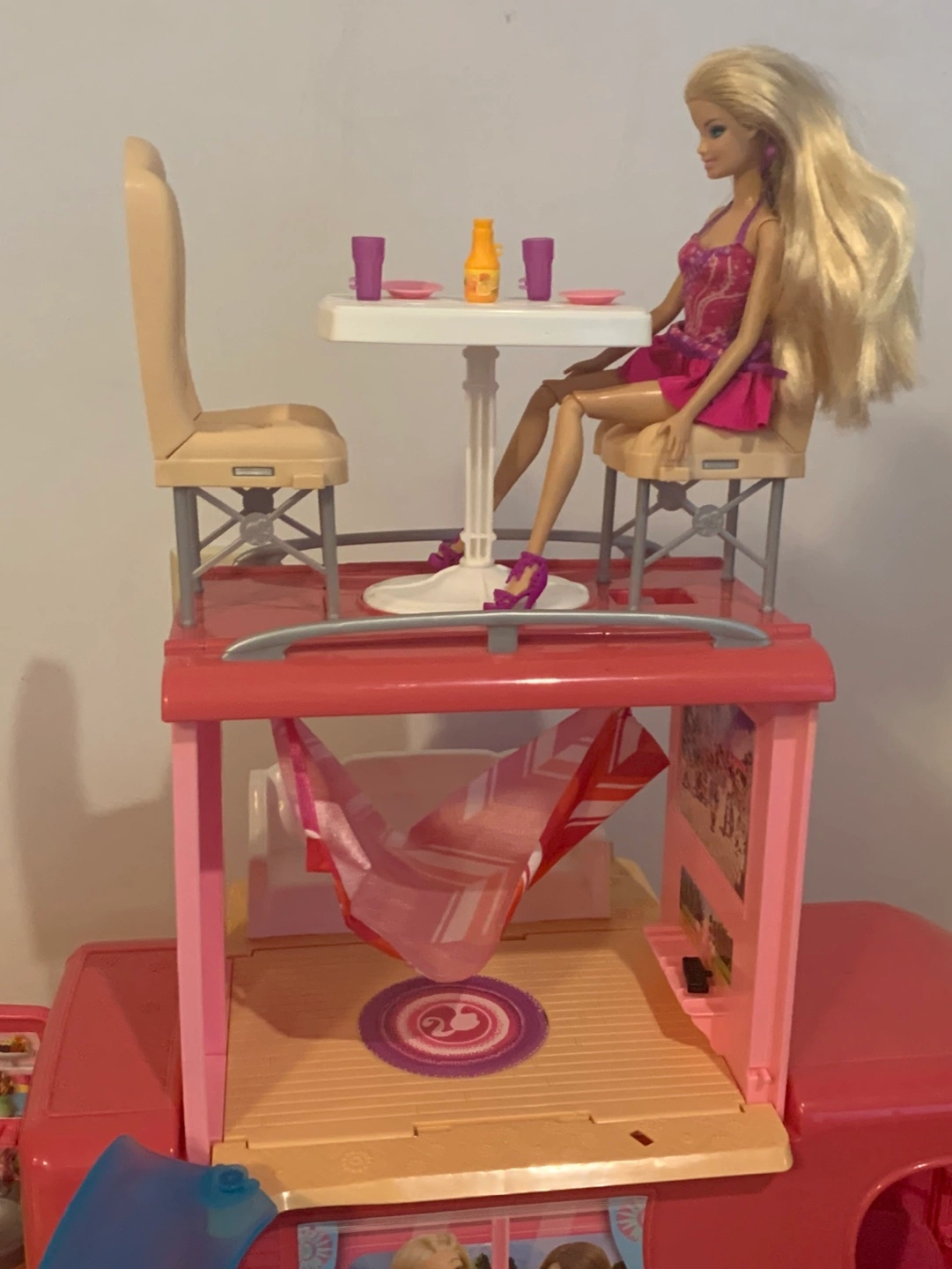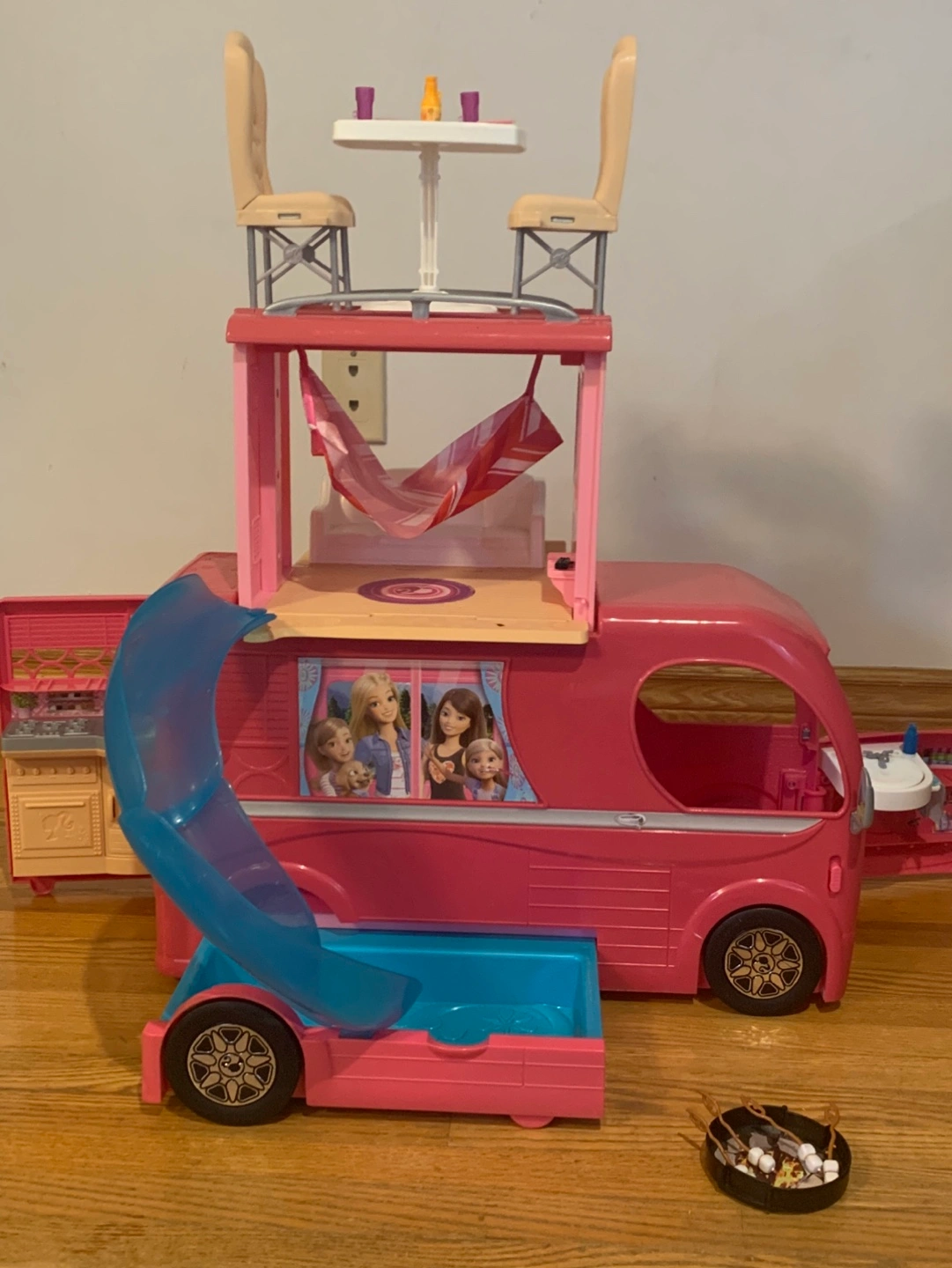 33Pink camper with working doors, table, chairs, hammock, and slide. Comes with fire pit and roasting marshmallows, kitchen accessories, bed, TV remote. Also including one Barbie.