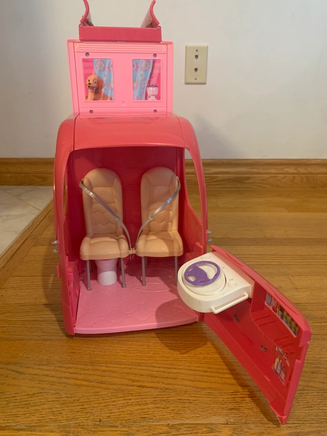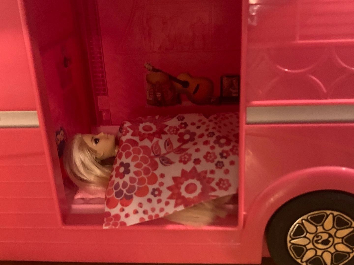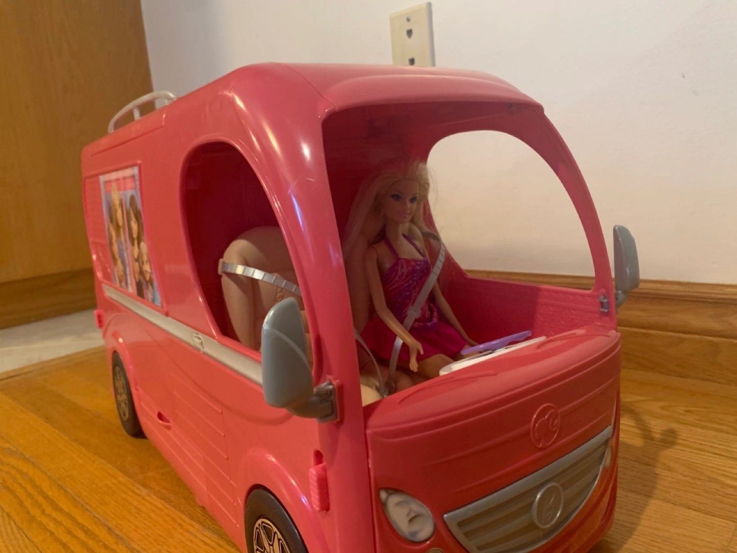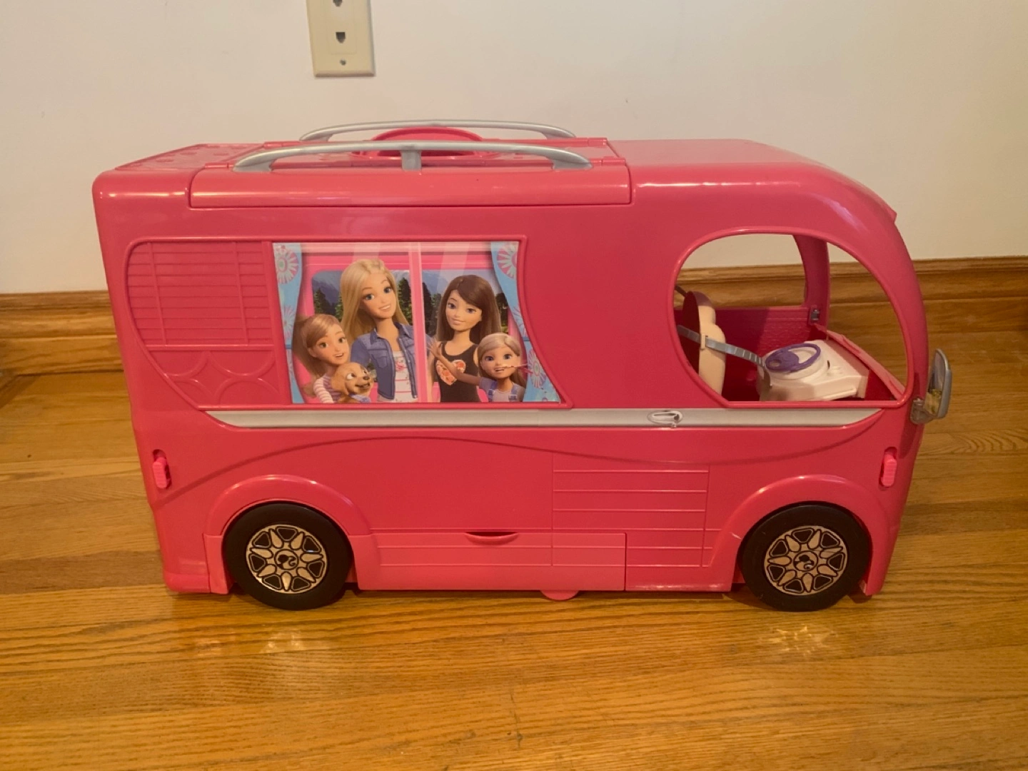 33Pink camper with working doors, table, chairs, hammock, and slide. Comes with fire pit and roasting marshmallows, kitchen accessories, bed, TV remote. Also including one Barbie.