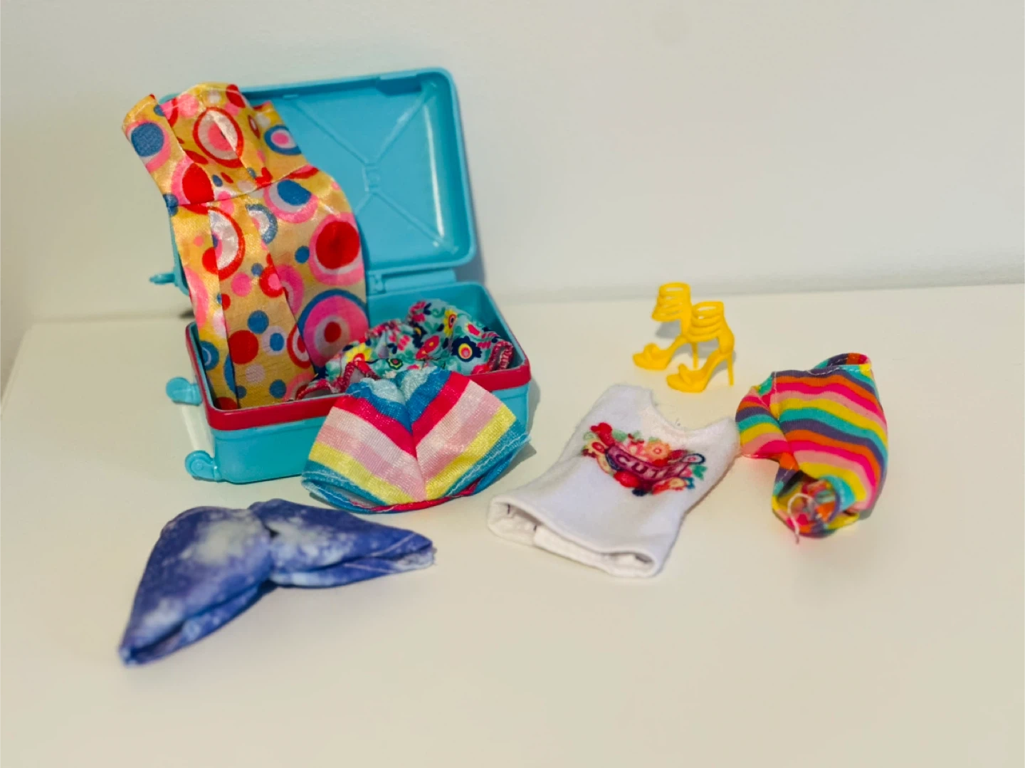 Selling a cute little set of Barbie doll clothes and accessories! Includes a blue suitcase, dresses, tops, skirts, and even a pair of yellow heels. Perfect for dressing up your Barbie!