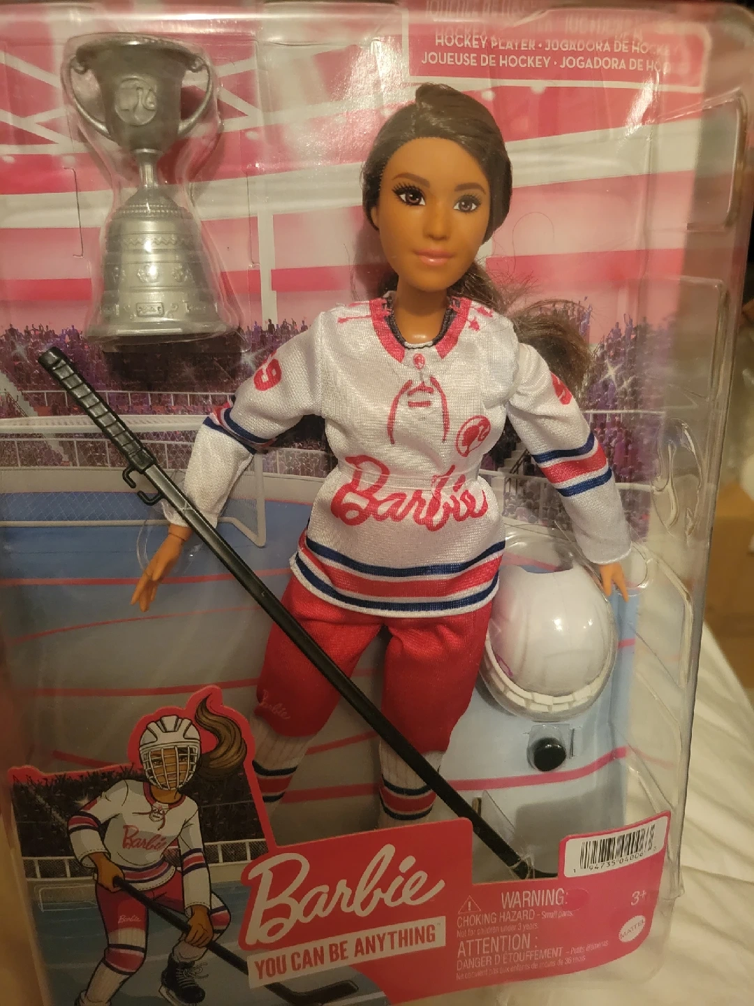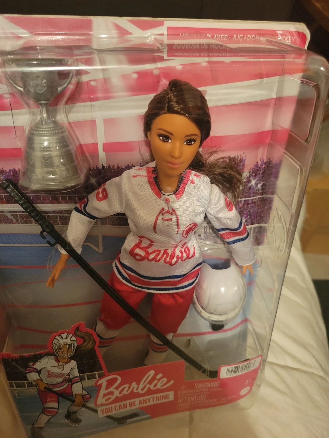 48Selling a brand new Barbie Hockey Player doll, still in its original packaging! It comes with a hockey stick, helmet, and trophy, ready for some fun on the ice. A great gift for any Barbie Collector